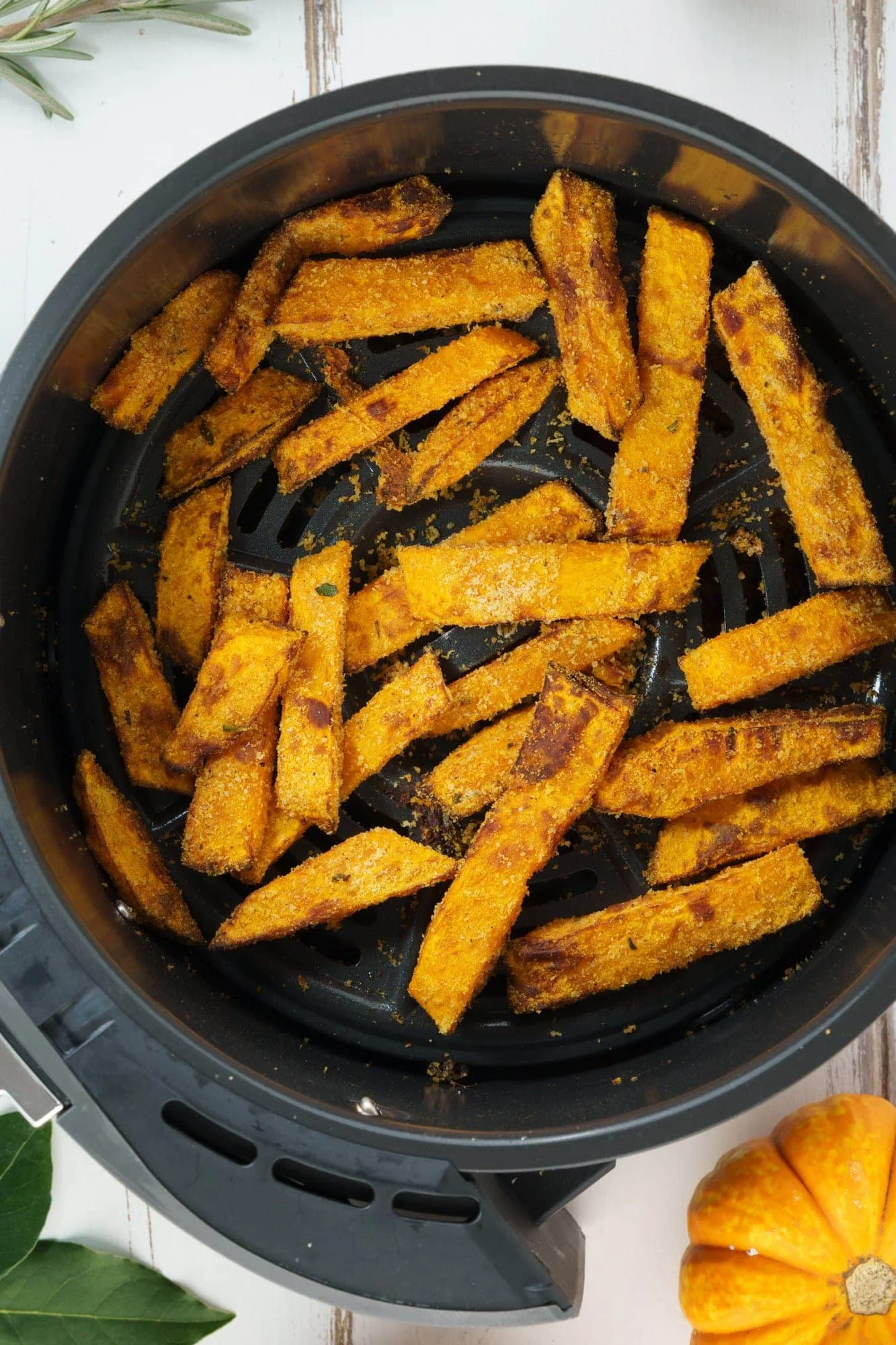 Side DishesAir Fryer Pumpkin FriesPumpkin Sticks in the Air Fryer are a tasty Healthy Snack great to enjoy as an appetizer snack or as a tasty appetizer. A vegan snack that is sure to win you over from the first bite.Difficulty MediumPreparation 10 minutesCooking 20 minutesServings for 4 people Send × Facebook Twitter Email Pinterest Save PrintAir Fryer Pumpkin Fries emerge as a swift and efficient alternative to the traditional oven-baked pumpkin fries. With the surge in popularity of air fryers, many have found this method to be preferable, achieving a crisp texture and delightful flavor.This pumpkin fries recipe epitomizes the essence of autumn. Simple and speedy to whip up, these fries make an irresistibly delicious snack. They’re the ideal accompaniment for an aperitif, a delightful starter, or the perfect munch to revel in as you unwind in front of the television, be it with a blockbuster movie or the latest episode of your favorite show. The ingredients for these golden delights, aside from the main star – pumpkin, include a touch of sage, rosemary, bay leaf, garlic, breadcrumbs, the exquisite Parmesan cheese, and a sprinkling of paprika to give it that extra kick.One of the primary advantages of using an air fryer is the efficiency and consistency with which it cooks. In a matter of minutes, you’ll be treated to perfectly crispy pumpkin fries, which you can season further to your heart’s desire. Be it an added dash of spices or a sprinkle of your favorite aromatic herbs, these fries are a canvas for your culinary artistry.Ingredients for 4 people1 kg of Pumpkin1 clove of Garlicto taste of Sageto taste of Rosemaryto taste of Bay leavesto taste of Paprikato taste of Bread Crumbsto taste of Parmesan Cheeseto taste of Table Saltto taste of Black Pepperto taste of Extra Virgin Olive OilCopy Ingredients ListOpen in AppMethodTo prepare Pumpkin Fries in the Air Fryer, wash the pumpkin thoroughly and carefully empty it of its seeds and filaments.Now cut the pumpkin into slices, peel them off, and then make them into sticks about the same size. Place the resulting sticks in a large bowl.Salt, pepper and add chopped rosemary, sage, bay leaf and a pinch of paprika.Now add the well-fine chopped garlic, a drizzle of olive oil and mix with your hands.Now add in breadcrumbs, Parmesan cheese and mix everything well.Pour the sticks into the basket of the air fryer and bake at 360°F (180°C) for about 20-25 minutes. When they are well browned and cooked, the Pumpkin Sticks are ready to be served and enjoyed hot. Finally, remember to download our App with exclusive content and fewer ads!Variations and AlternativesIf desired, you can enrich your Pumpkin Sticks in the Air Fryer with the spices or herbs you like best such as thyme, cilantro, spicy paprika, etc.More Pumpkin Recipes to Try:Air Fryer Roasted PumpkinPumpkin CookiesPumpkin and Italian Sausage LasagnaPumpkin SyrupTipsIf you want Pumpkin Fires in the Air Fryer extra crispy, we recommend making “fine” sticks and coating them well with lots of bread crumbs and grated cheese.StoragePumpkin Sticks in the Air Fryer should be eaten immediately; in case they are left over you can store them in a paper bag in the refrigerator.Comments ★ ★ ★ ★ ★ × 5 / 5 You need to enable JavaScript to vote Cancel reply Leave a comment