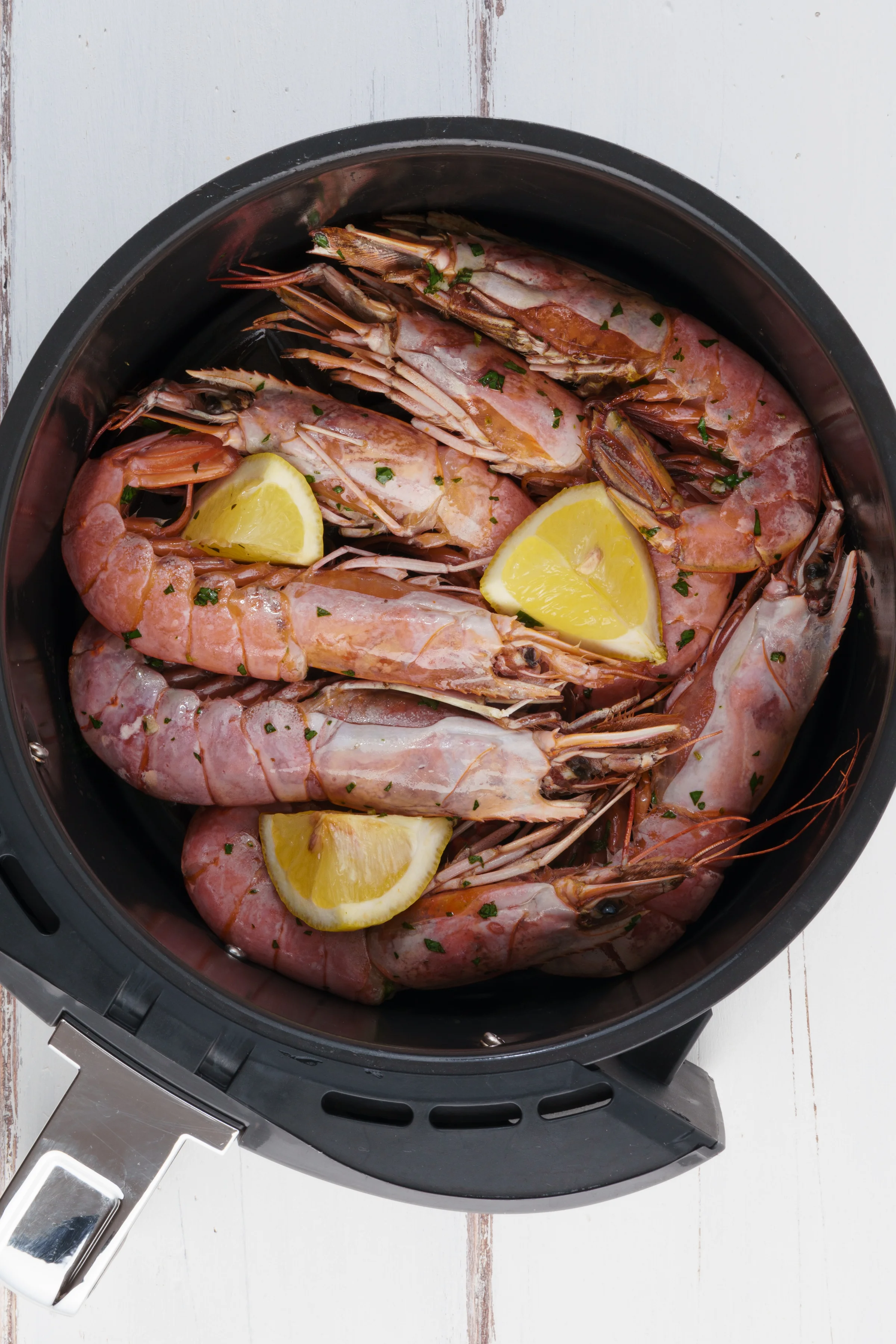 MainsAir Fryer Spicy Garlic PrawnsShrimp with an Air Fryer is a quick and easy way to prepare tasty Prawns by using an air fryer, an appliance that is increasingly present in our kitchens.Difficulty MediumPreparation 5 minutesCooking 5 minutesServings for 2 people Send × Facebook Twitter Email Pinterest Save PrintThe Prawns with Air Fryer Recipe is a quick and easy Air Fryer Recipe great for bringing to the table a seafood main course in very few minutes and with minimal effort and especially electricity. Flavored with a sauce made from Fresh Parsley, Extra Virgin Olive Oil and Lemon Juice, the Cooked Prawns with an Air Fryer is a perfect dish for all occasions.When you embark on preparing Jumbo Prawns in your Air Fryer, you’re signing up for a journey of rich flavors, encapsulated in a dish that requires minimal effort. Imagine bringing to your table a seafood delicacy, each prawn perfectly cooked and infused with a vibrant medley of Fresh Parsley, Extra Virgin Olive Oil, and a zestful kiss of Lemon Juice. It’s not just a meal; it’s an elevation of the humble prawn to a celebration-worthy fare.But the beauty of this dish lies not only in its gourmet appeal. The real charm is its accessibility. With the air fryer’s revolutionary cooking approach, these prawns don’t have to be a rare indulgence. Whether you’re marking a special occasion or transforming a regular evening into a culinary delight, this dish is your go-to selection. The quick, efficient cooking process seals in flavors, yielding prawns that are a joy to savor on their own or as the star ingredient in more complex creations: that’s why we love Air Fryer Recipes like this one.Jumbo Prawns with Air Fryer transcends the ordinary, offering you the luxury of fine dining within the comfort of your home, efficiently harnessing the prowess of air-frying technology. It’s about making extraordinary meals accessible, transforming the way you perceive and enjoy seafood. So, ready your air fryer; a sumptuous, easy-to-prepare seafood extravaganza is just a few moments away.Ingredients for 2 people8 Prawns1 Lemonto taste of Parsleyto taste of Table Saltto taste of Black Pepperto taste of Extra Virgin Olive Oil1 clove of GarlicCopy Ingredients ListOpen in AppMethodTo prepare Prawns with Air Fryer start by placing chopped fresh parsley, a little salt, pepper, extra virgin olive oil, finely chopped garlic clove and a few drops of lemon juice in a small bowl. Clean the prawns under running water and place them in the basket of the air fryer.Brush the prawns with the parsley sauce, arrange a few lemon slices in the basket and bake at 360°F (180°C) for 10 minutes.When the prawns are cooked, remove them from the basket and serve the Prawns with Air Fryer piping hot accompanied by a few lemon slices. Finally, remember to download our App with exclusive content and fewer ads!Variations and AlternativesYou can enrich your Air Fryer Prawns with your favorite spices such as Thyme, Rosemary or Sage which will give a Mediterranean taste and aroma.TipsCooking time, as you know, varies depending not only on the size of the shrimp but also on the type of air fryer you are using.StoragePrawns with an Air Fryer will keep in the refrigerator for 1 day.Comments ★ ★ ★ ★ ★ × 4 / 5 You need to enable JavaScript to vote Cancel reply Leave a comment