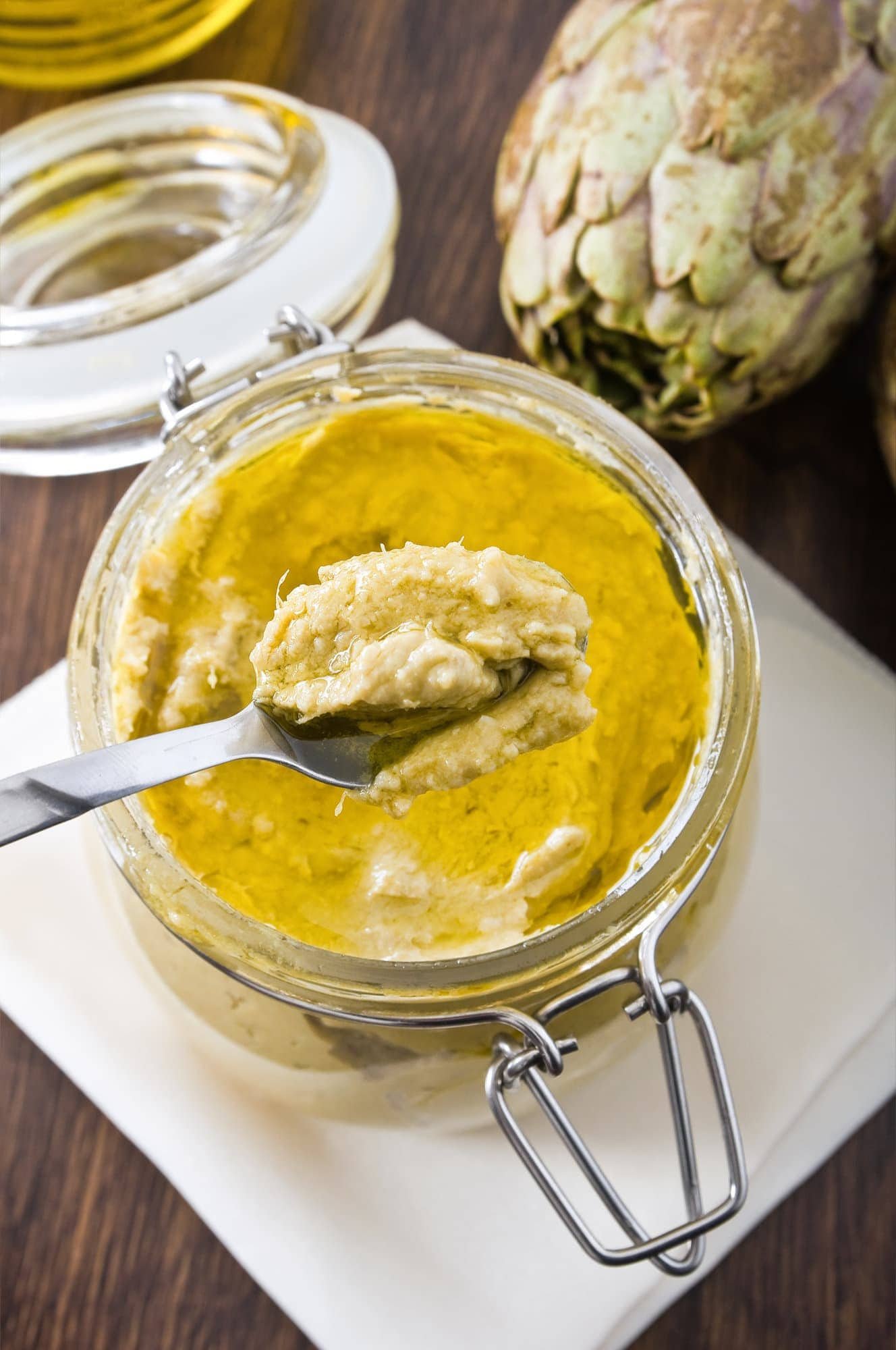 Sauces and GraviesArtichoke PestoPerfect for seasoning pasta or spread on bread, Artichoke Pesto is made in just minutes by blending artichokes with almonds, Parmesan cheese, and olive oil. A clever recipe for a truly tasty sauce.Difficulty EasyPreparation 15 minutesCooking 10 minutesServings for Serves 4 Send × Facebook Twitter Email Pinterest Save PrintComing up with a different pasta sauce every day that is also simple and quick can be challenging. In reality, by using seasonal ingredients, especially vegetables, it is possible to create truly incredible preparations like Artichoke Pesto, perfect not only for seasoning pasta but also for filling toast and sandwiches.The Artichoke Pesto Recipe simply involves blending artichokes, stewed in a pan for about ten minutes, with Parmigiano, almonds, and garlic, adjusting the consistency in the usual way with olive oil and flavoring, instead of basil, with marjoram. No one is stopping you from preparing this Artichoke Recipe using Frozen Artichokes, already cleaned and ready to be cooked.Among other Artichoke Recipes, we recommend trying the Artichoke and Parmigiano Casserole, the Pasta Timballo with Sausage and Artichokes, or the tasty Savory Artichoke Strudel.Ingredients for Serves 44 Artichockes150 ml of Extra Virgin Olive Oil100 g of Parmesan Cheese50 g of Almonds1 clove of Garlicto taste of Marjoramto taste of SaltCopy Ingredients ListOpen in AppMethodTo prepare the Artichoke Pesto, start by cleaning the artichokes: remove the toughest outer leaves, cut off the tips, and finally remove the fuzzy choke from the center. If you need guidance, you can follow our guide on How to Clean Artichokes.Cut them into quarters and cook them in a pan with one tablespoon of oil (taken from the total amount) for about ten minutes, until tender. Finally, season with salt to taste.Transfer the artichokes to a food processor along with the garlic, almonds, marjoram, and Parmigiano cheese. Blend while gradually adding the oil in a steady stream until you achieve a thick and creamy consistency.Store the Artichoke Pesto in a glass jar and cover the surface with a thin layer of olive oil before placing it in the refrigerator. This will help preserve the vibrant color and prevent oxidation. Finally, remember to download our App with exclusive content and fewer ads!Variations and AlternativesAs with all Vegetable Pesto recipes, you can substitute the nuts with others of your choice, such as pine nuts, or use half Pecorino cheese instead of Parmesan cheese.TipsFor a lighter version of the Artichoke Pesto, you can halve the amount of olive oil and replace it with water to maintain a creamy consistency while reducing the caloric content.StorageArtichoke Pesto can be stored in the refrigerator for 2-3 days in a sealed glass jar. Alternatively, you can freeze it in individual portions.Comments ★ ★ ★ ★ ★ × 4 / 5 You need to enable JavaScript to vote Cancel reply Leave a comment