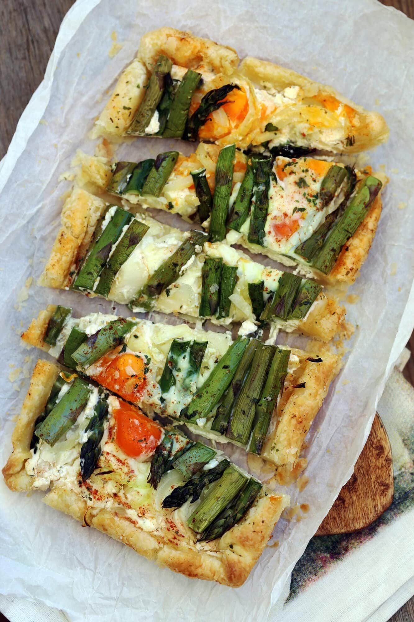 Savory PiesAsparagus and Cheese Savory TartAsparagus and Cheese Savory Tart is an incredibly simple recipe that's perfect for using up leftovers. You can serve it as an appetizer, at a cocktail party, or even take it along for a picnic!Difficulty MediumPreparation 15 minutesCooking 15 minutesServings for 8 servings Send × Facebook Twitter Email Pinterest Save PrintThe Asparagus and Cheese Savory Tart is a delicious leftover-friendly recipe that lets you use up whatever cheese you have in your fridge! Easy and quick to prepare, this rustic quiche, much like the Mushroom and Cheese Tart, is perfect for using all those leftover pieces of cheese you don’t know how to finish!This savory quiche with asparagus, cheeses, and eggs is ideal to make for an aperitif, but also works great as a starter or for lunch at work. It’s also the perfect dish to bring along for an Easter picnic!If you love tasty savory tart recipes, you should also try Khachapuri, the Georgian bread-pizza filled with eggs and cheese, the Asparagus and Sun-Dried Tomato Tart, and the Cheese Strudel! Now here’s the recipe for the Asparagus and Cheese Savory Tart!Ingredients for 8 servings1 roll of Puff Pastry rectangular10 Asparagus2 Eggs200 g of Gorgonzola Cheese100 g of Taleggio Cheese100 g of Brie Cheese3 tablespoons of Ricotta CheeseCopy Ingredients ListOpen in AppMethodTo prepare the Asparagus and Cheese Savory Pie, start by washing and trimming the asparagus. Cook them in lightly salted boiling water for about 5 minutes until they are still al dente, then drain them.While the asparagus is cooking, dice the gorgonzola, taleggio, and brie cheese, then place them in a medium-sized bowl. Add the ricotta cheese and mix until you achieve a creamy and smooth consistency.Roll out the puff pastry on a flat surface, creating edges on the sides to prevent the cheese from spilling out during baking. Prick the surface with a fork and pour the cheese and ricotta mixture on top. Arrange the asparagus as desired, and finally crack the eggs on top.Bake at 160°C (320°F) in a fan-assisted oven for 15 minutes, or for the same amount of time at 180°C (356°F) in a static oven. Once done, take it out of the oven and serve your Asparagus and Cheese Savory Pie! Finally, remember to download our App with exclusive content and fewer ads!Variations and AlternativesYou can make the Asparagus and Cheese Savory Pie with any cheese you have on hand.TipsThe Asparagus and Cheese Savory Pie can be enjoyed both hot and cold, so feel free to serve it according to your preference.StorageThe Asparagus and Cheese Savory Pie can be stored in the refrigerator for up to one day, kept in an airtight container.Comments ★ ★ ★ ★ ★ × 5 / 5 You need to enable JavaScript to vote Cancel reply Leave a comment