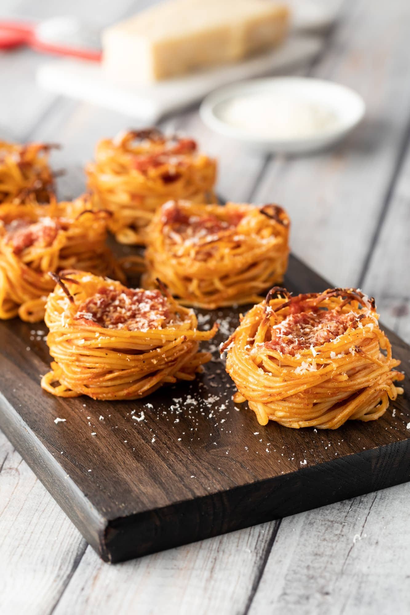 PastaBaked Spaghetti NestsBaked Spaghetti Nests are a delicious way to repurpose leftover spaghetti from lunch or to prepare a unique appetizer or finger food that's different from the usual!Difficulty MediumPreparation 15 minutesCooking 15 minutesServings for Serves 4 Send × Facebook Twitter Email Pinterest Save PrintBaked Spaghetti Nests are a delicious way to repurpose leftover spaghetti or to prepare a unique appetizer or finger food that’s different from the usual!While this might be an unconventional way to cook spaghetti, among all the recipes for recycling leftover pasta, this is definitely the most original and tasty! It’s an Easy and Quick Recipe using leftover pasta that will allow you to create delicious Crispy Pasta Baskets, perfect as finger food for appetizers. They’re truly delightful!Whether you have leftover Tomato Spaghetti or Meat Sauce Spaghetti, you can prepare these Spaghetti Nests with various types of pasta dishes, just make sure the sauce is suitable for a second baking.This recipe can undoubtedly be defined as a Leftover Recipe with guaranteed results, perfect for when you’re short on time but want to serve something tasty and original.In our version, you’ll find a twist on the Traditional Spaghetti Nests Recipe, a variation that will give you Baked Spaghetti Nests with a Melting Cheese Core.Ingredients for Serves 4400 gams of Spaghetti400 gams of Crushed Tomatoes1 Garlic1 White Onionsto taste of Scamorza Cheeseto taste of Parmesan Cheeseto taste of Extra Virgin Olive Oilto taste of Basilto taste of Saltto taste of Black Pepperto taste of White SugarCopy Ingredients ListOpen in AppMethodTo prepare the Baked Spaghetti Nests, if you’re recycling leftover spaghetti from lunch, skip this step and go directly to step three. Start by preparing the tomato sauce: dice the onion and sauté it with the garlic clove in a pan with some olive oil until golden. Season with salt, pepper, and add a pinch of sugar (this will help balance the tomato’s acidity). Cook over low heat for 20 minutes, stirring occasionally, adding 2-3 torn basil leaves halfway through cooking.Cook the spaghetti in plenty of salted water. Drain them al dente, 2-3 minutes before the package instructions indicate. Transfer them to the pan with the sauce, finish cooking, sprinkle with abundant grated Parmesan cheese, and mix everything well.Using kitchen tongs, twirl a portion of spaghetti around a ladle to form a nest shape. Carefully place it in a previously oiled or buttered muffin tin and continue until you’ve used all the spaghetti.Once you’ve formed all your Spaghetti Nests, hide a cube of scamorza cheese (Italian smoked mozzarella) in the center of each nest. Bake in a preheated oven at 200°C (392°F) for 15-20 minutes, then finish with 5-10 minutes under the grill until golden brown and crispy.When they’re nicely golden, remove your Baked Spaghetti Nests from the tin and serve them piping hot with a generous sprinkle of grated cheese on top. Finally, remember to download our App with exclusive content and fewer ads!Variations and AlternativesYou can substitute the Scamorza cheese with Smoked Provolone or Pizza Mozzarella (low-moisture mozzarella).TipsIf you use leftover cold pasta, it will be easier to shape your Spaghetti nests, but you might need a few extra minutes of baking time in the oven.StorageThese Spaghetti Nests are best served immediately. We don’t recommend storing them, especially if you’ve used previously cooked ‘recycled’ pasta.Comments ★ ★ ★ ★ ★ × 5 / 5 You need to enable JavaScript to vote Cancel reply Leave a comment