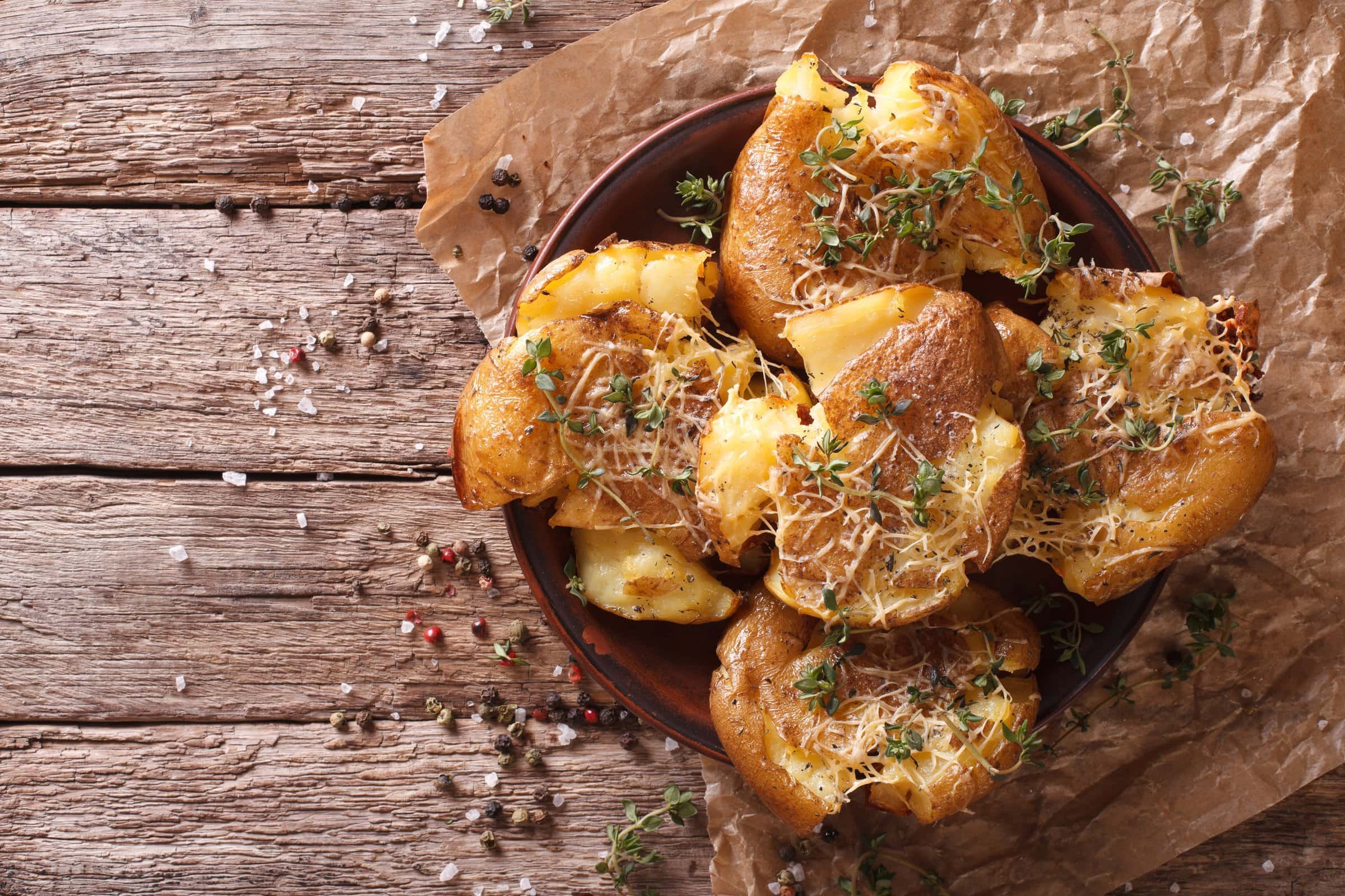 Side DishesCheesy Crash Hot PotatoesCheesy Crash Hot Potatoes are a delicious Australian-style side dish made of oven-baked smashed potatoes topped with melted cheese.Difficulty EasyPreparation 5 minutesCooking 45 minutesServings for 4 servings Send × Facebook Twitter Email Pinterest Save PrintThe Cheesy Crash Hot Potatoes are a delicious side dish originating from Australia, created by food writer Jill Dupleix, who transformed the classic Baked Potatoes into an easy-to-make and truly special side!Made simply with Potatoes, Extra Virgin Olive Oil, Salt, and Pepper, this version of Crash Hot Potatoes is enriched with Grated Parmigiano Reggiano, making this dish even more flavorful and tasty! If you want to offer something different to your guests, but with the certainty of preparing a side dish that everyone will love, these Australian Smashed Potatoes are just what you need!If you love Baked Potato Side Dishes, don’t miss the Baked Potatoes with Bacon and Cheese, the Four Cheese Potatoes, and the Creamy Cheese Potatoes! And now here is the recipe for the Cheesy Crash Hot Potatoes!Ingredients for 4 servings800 gams of New Potatoes Smallto taste of Parmesan Cheeseto taste of Extra Virgin Olive Oilto taste of Table Saltto taste of Black PepperCopy Ingredients ListOpen in AppMethodTo prepare Cheesy Crash Hot Potatoes, start by thoroughly washing the potatoes. Cook them in plenty of boiling water for about 20 minutes, or until they are well cooked through.Take a baking tray, line it with parchment paper and drizzle some extra virgin olive oil on the paper. When the potatoes are ready, drain them and arrange them on the tray, making sure to leave enough space between each potato.Flatten each potato using a fork or, even better, a potato masher. Brush with extra virgin olive oil, sprinkle with pepper and add a pinch of salt.Using a coarse grater, grate the Parmigiano Reggiano cheese (aged Italian parmesan) and sprinkle it over the potatoes. Bake in a preheated oven at 250°C (482°F) for about 20-25 minutes, placing the tray on the upper rack of the oven.When the Parmigiano is well melted and the potatoes are golden and crispy, remove from the oven and serve your Cheesy Crash Hot Potatoes! Finally, remember to download our App with exclusive content and fewer ads!Variations and AlternativesYou can substitute Parmigiano Reggiano with other easily melting cheeses like Fontina, Provolone, or Mozzarella. If you prefer, you can skip the cheese altogether and season your Crash Hot Potatoes with spices like Paprika, Chili Powder, or Curry.TipsFor making Cheesy Crash Hot Potatoes, we recommend using organic potatoes with edible skin. If you can’t find them, we suggest peeling the potatoes before using them in the recipe.StorageCheesy Crash Hot Potatoes are best enjoyed immediately after preparation, but if you have leftovers, they can be stored in an airtight container in the refrigerator for up to one day.Comments ★ ★ ★ ★ ★ × 5 / 5 You need to enable JavaScript to vote Cancel reply Leave a comment