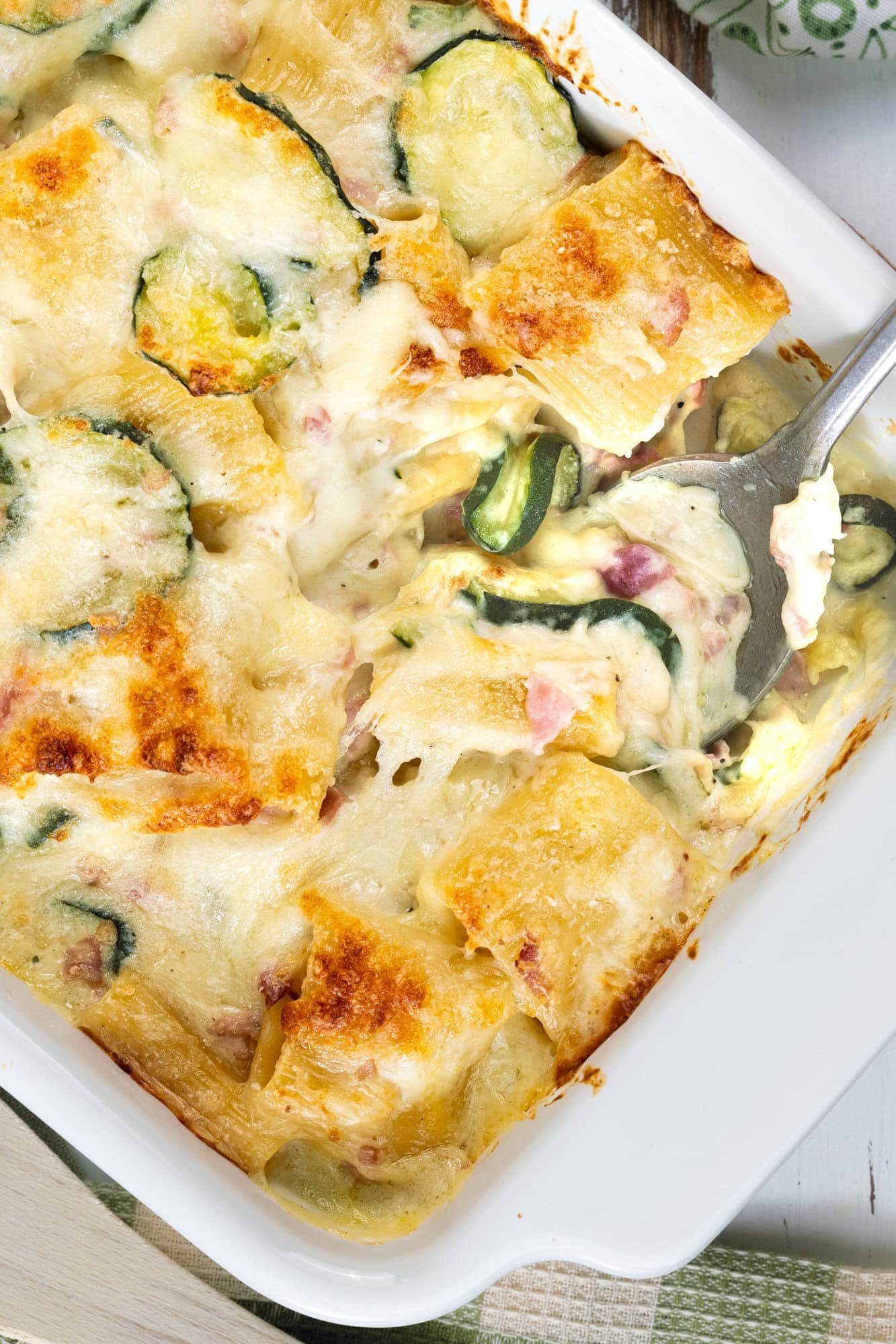 PastaCreamy Baked Pasta with ZucchiniA delicious white baked pasta dish with zucchini and béchamel sauce, creamy and stringy thanks to provola and mozzarella cheese. Perfect for Easter, it's ideal for family lunches or special dinners.Difficulty MediumPreparation 15 minutesCooking 25 minutesServings for 6 servings Send × Facebook Twitter Email Pinterest Save PrintCreamy Baked Pasta with Zucchini and Bechamel is a creamy and irresistible first course, perfect for those looking for a tasty alternative to the classic red baked pasta. Thanks to the combination of provola and mozzarella, this recipe offers a melting and enveloping heart, made even more delicate by the presence of zucchini. A simple dish to prepare but with a refined flavor, ideal for any special occasion.This white version is perfect for those who love baked pasta without tomato, and it is also a winning choice for festive lunches. In fact, the Recipe for Creamy Baked Pasta with Zucchini and Ham is an excellent idea for the Easter menu, thanks to its balance of delicate flavors and the irresistible creaminess of the bechamel. The Baked Pasta with Zucchini, Provola, and Bechamel can also be prepared in advance and gratinated at the moment, making it perfect for those who want to organize a stress-free lunch.Whether it’s for a family lunch, a dinner with friends, or a special occasion like Easter, this recipe will win everyone over with its goodness and creamy texture. Discover how to prepare Creamy Baked Pasta with Zucchini and Bechamel and bring to the table a refined and irresistible first course.Ingredients for 6 servingsFor the Baked Pasta with Zucchini:500 gams of Paccheri500 gams of Zucchini150 gams of Ham100 gams of Mozzarella100 gams of Provolas1 clove of Garlicto taste of Table Saltto taste of Extra Virgin Olive OilFor the Béchamel:500 milliliters of Milk50 gams of All Purpose Flour50 gams of Butterto taste of Table Saltto taste of NutmegFor Garnishing:to taste of Parmesan Cheese GratedCopy Ingredients ListOpen in AppMethodTo prepare White Baked Pasta with Zucchini, start by washing the zucchini thoroughly, trim them and slice them into rounds. Heat a drizzle of olive oil in a pan with a clove of garlic and let it brown for a moment. Add the zucchini, season with salt and pepper, and cook over low heat for about 10-15 minutes. The zucchini should be cooked but still maintain some firmness.Cook the pasta in plenty of salted boiling water and drain it when half-cooked (al dente). While the pasta is cooking, prepare the béchamel sauce: put butter in a saucepan, let it melt, add the flour and create a roux.Pour in the milk, add salt and a pinch of nutmeg, and continue stirring over low heat until the béchamel sauce thickens.In a large bowl, combine the zucchini, chopped ham, béchamel sauce, and coarsely grated mozzarella and provolone cheese. Add the grated Grana Padano cheese and finally the pasta.Mix everything well to combine all ingredients thoroughly and transfer the dressed pasta to a baking dish. Level the surface, sprinkle with some grated cheese, and bake in a preheated fan-forced oven at 180°C (356°F) for about 30 minutes.Once baking is complete, remove the White Baked Pasta with Zucchini from the oven and let it rest for a few minutes before serving. Finally, remember to download our App with exclusive content and fewer ads!Variations and AlternativesIf desired, you can substitute regular Provolone with Smoked Provolone (Provola Affumicata) to give the dish a more distinctive flavor.TipsFor a perfect White Baked Pasta with Zucchini, it’s crucial not to overcook the zucchini, otherwise they will break down when mixing with other ingredients.StorageWhite Baked Pasta with Zucchini can be stored in the refrigerator for 1-2 days without any issues.Comments ★ ★ ★ ★ ★ × 5 / 5 You need to enable JavaScript to vote Cancel reply Leave a comment