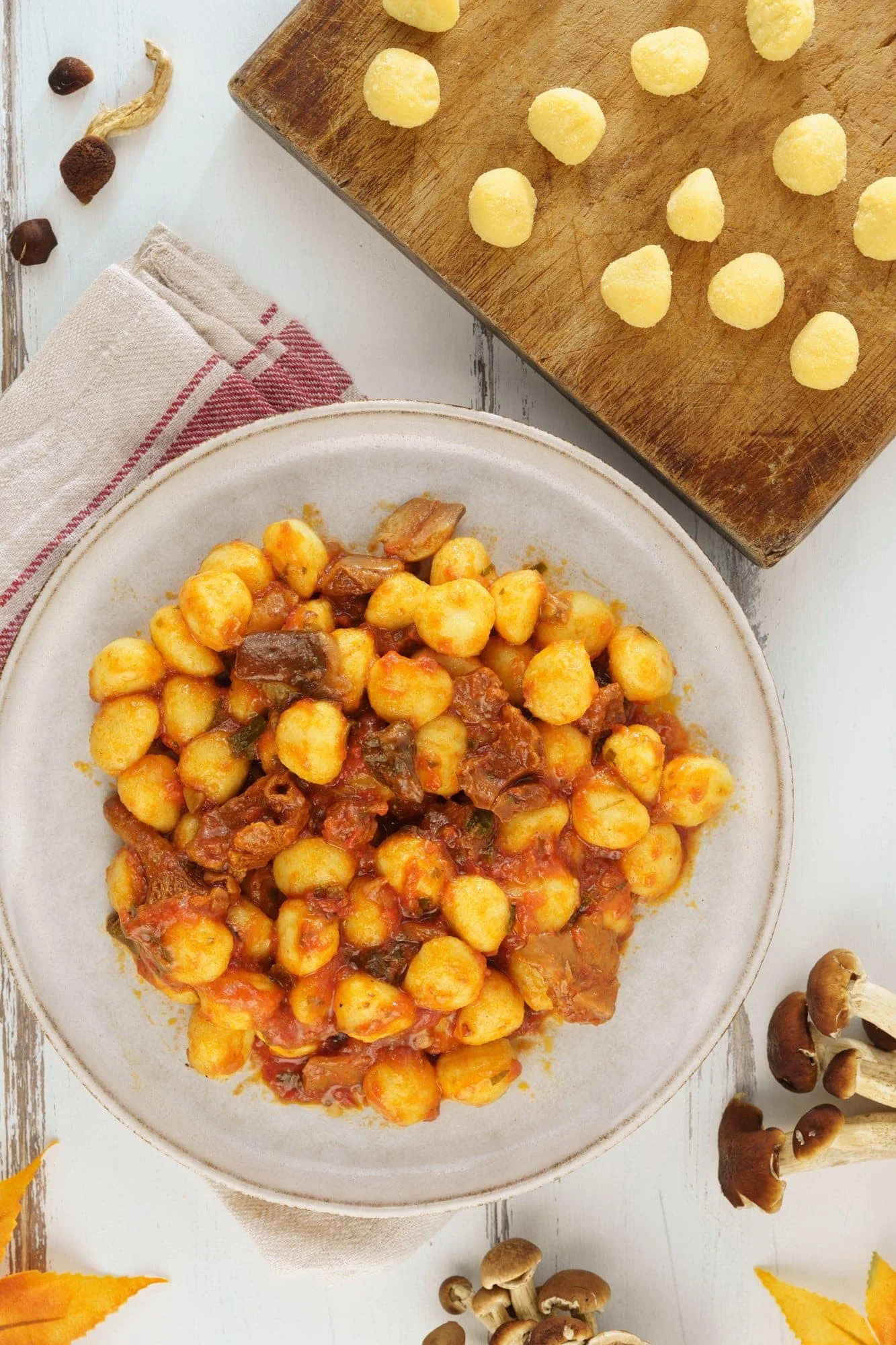 First CoursesGnocchi with Tomato and MushroomsDive into a seasonal treat with ourGnocchi with Tomato and Mushrooms. Perfectly capturing the essence of fall, this dish promises to be a favorite for those special occasions or when you simply wish to elevate your dinner game.Difficulty EasyPreparation 10 minutesCooking 40 minutesServings for 4 people Send × Facebook Twitter Email Pinterest Save PrintIndulge in the warm, comforting flavors of autumn with our Tomato and Mushroom Gnocchi – a delectable dish that combines simplicity with gourmet flair.These gnocchi, bursting with the rich tastes and earthy aromas typical of fall, make for an ideal entrée for both celebratory luncheons and those nights when you crave something a touch special. Depending on your preference or pantry stock, you can opt for fresh, frozen, or dried mushrooms. Just remember: if you’re using dried mushrooms, rehydrate them in warm water for 20-30 minutes before integrating them into your sauce.For the true home-cooked experience, we recommend pairing this sauce with fresh, homemade gnocchi. If you’re keen to try, have a look at our detailed Homemade Gnocchi recipe. However, if time is of the essence, quality supermarket-packaged gnocchi works just as well.Ingredients for 4 people600 g of Mushrooms Frozen500 g of Crushed Tomatoes1 clove of Garlic1 tablespoon of Tomato Pasteto taste of White Wineto taste of Red Onionsto taste of Sageto taste of Rosemaryto taste of Bay leavesto taste of Parsleyto taste of Table Saltto taste of Extra Virgin Olive OilCopy Ingredients ListOpen in AppMethodTo prepare the Tomato and Mushroom Gnocchi start by preparing the Tomato and Mushroom Sauce by sautéing some chopped onion and a clove of garlic in a pan with a drizzle of olive oil. Once the onion is browned, add the frozen mushrooms, deglaze with a little white wine and cook for a few minutes over medium heat.When the mushrooms have thawed and the alcohol part of the wine has evaporated, add the herbs and tomato paste.Now put in the tomato pulp, season with salt and pepper, and cook on a gentle heat with the lid lightly flaked for 15-20 minutes, stirring occasionally.When the Tomato and Mushroom Sauce is ready add some’ chopped fresh parsley and cook for a few more minutes so that the sauce can shrink slightly.Bake the gnocchi in plenty of hot salted water and, once they come to the surface, drain them, add them to the sauce and mix well. Serve the Tomato and Mushroom Gnocchi piping hot accompanied by a good sprinkling of Parmesan Cheese. Finally, remember to download our App with exclusive content and fewer ads!Variations and AlternativesIf you like, you can enrich your Gnocchi with Tomato and Mushroom Sauce by adding a little chili pepper to the Tomato and Mushroom SauceMushroom aficionado? Dive into our must-try Mushroom Recipes:Mushroom-Beef Pasta SauceCreamy Tomato Mushroom PastaSkillet Chicken and MushroomsTipsIf you are using frozen mushrooms, cook them directly in the pan with the sautéed garlic and allow the water to dry completely before adding the passata. If you use dried mushrooms instead, soak them in warm water for about ten minutes and then add them to the sauté. Do not brown the dried mushrooms too long because they may burn. Finally if the sugo should be a bit acidic add half a teaspoon of sugar to adjust it.StorageThe Tomato and Mushroom Gnocchi will keep in the refrigerator, inside an airtight container for 1 day.Comments ★ ★ ★ ★ ★ × 5 / 5 You need to enable JavaScript to vote Cancel reply Leave a comment