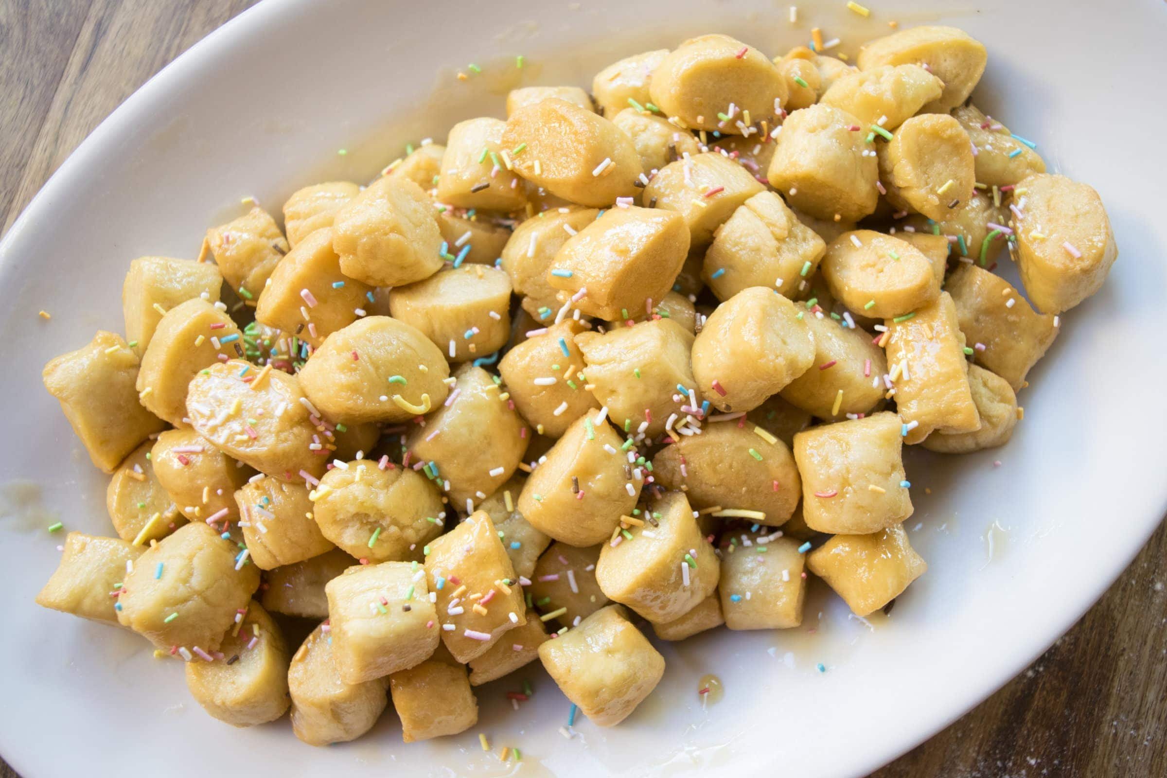 DessertsHoney Balls (Struffoli)Struffoli (Honey Balls) is a delicious Carnival dessert from Southern Italy: in Calabria, they prepare it with honey (Pignolata al Miele), while in Sicily, it's served with a sugar glaze (Pignolata Glassata).Difficulty MediumPreparation 20 minutesCooking 20 minutesServings for Serves 4 Send × Facebook Twitter Email Pinterest Save PrintPignolata (also known as Honey Balls or Struffoli) is a delicious Carnival dessert typical of Southern Italy that’s quick and easy to prepare. Similar to Cicerchiata and Neapolitan Struffoli, Pignolata is traditionally made in two different ways: Calabrian Pignolata is coated with honey, while Sicilian Pignolata features both chocolate and lemon glazes.In this recipe, we’ll make the honey-coated version, which is more closely associated with Carnival thanks to its decoration of colored sprinkles that resemble confetti. At the end of the recipe, we’ll also explain how to prepare the glazed Pignolata.If you love Southern Italian Carnival desserts, you’ll also want to try Honey Fritters (Frittelle al Miele) and Sicilian Cartocci! Now, let’s discover together how to make Pignolata!Ingredients for Serves 4For the Dough:300 g of All Purpose Flour30 g of Butter20 g of Sugar20 g of Grappa2 Eggs1 Egg Yolks1 Lemon Peelto taste of Table SaltFor Frying:600 g of Seed OilFor Garnishing:160 g of Honeyto taste of Colored PastaCopy Ingredients ListOpen in AppMethodTo prepare Pignolata (a traditional Italian honey-glazed pastry), start by sifting the flour into a bowl. Add the softened butter cut into cubes, sugar, a pinch of salt, lemon zest, grappa (Italian brandy), eggs and egg yolk.Knead the mixture vigorously and, when it becomes more compact and well-combined, transfer it to a floured work surface.Continue working the dough until you obtain a smooth and homogeneous mixture. Shape it into a classic loaf, wrap it in plastic wrap and let it rest in the refrigerator for at least 2 hours.After the resting time, take the dough and form small rolls about half an inch in diameter. Cut them every half inch to create small pieces about the size of a marble.Pour the oil into a large pot and heat it until it reaches 170°C (338°F). Add the dough pieces a few at a time to avoid lowering the oil temperature too much.Cook the pieces for about 3-4 minutes, remove them from the pot with a slotted spoon and transfer them to a plate lined with kitchen paper to remove excess oil.Once all pieces are cooked, transfer them while still hot to a bowl and pour honey over them. Mix to combine and transfer to a serving plate. Decorate with colored sprinkles and serve your Pignolata! Finally, remember to download our App with exclusive content and fewer ads!Variations and AlternativesTo make a Glazed Pignolata, simply replace the Honey with Chocolate Glaze and Lemon Glaze.TipsTo check if the oil temperature is perfect, we recommend using a [amazon link=”B06WWJJH3L” title=”food thermometer” link_class=”link-amazon”].StorageThe Pignolata (traditional Italian honey balls) can be stored for a couple of days under a glass dome.Comments ★ ★ ★ ★ ★ × 5 / 5 You need to enable JavaScript to vote Cancel reply Leave a comment