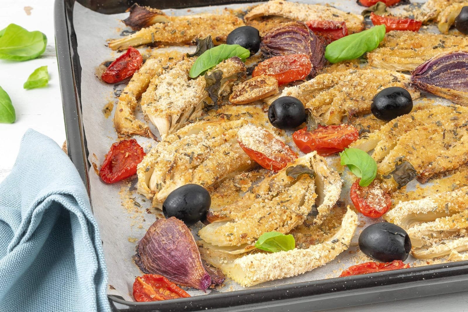 Side DishesMediterranean Baked Fennel, a Delicious Side DishMediterranean Baked Fennel is a tasty side dish featuring fennel that is easy and quick to prepare, combining the typical flavors and aromas of Mediterranean culinary tradition in a single dish. This vegetarian side will win you over.Difficulty MediumPreparation 10 minutesCooking 45 minutesServings for Serves 4 Send × Facebook Twitter Email Pinterest Save PrintMediterranean Baked Fennel is a flavorful side dish featuring oven-baked fennel with the aroma and taste typical of the Mediterranean, making it an ideal accompaniment for both fish and meat main courses.This recipe is quick and simple, ready in under 30 minutes, turning fennel into a perfect choice for anyone seeking a healthy yet tasty option at the table. The blend of flavors and scents calls to mind the culinary traditions of the Mediterranean, offering an authentic and satisfying gastronomic experience. The combination of fennel, red onions, garlic, cherry tomatoes, and aromatic herbs creates a truly delicious side dish that will win you over from the very first bite.If you are looking for a versatile side that can easily enrich your weekly menu with freshness and flavor, Mediterranean Baked Fennel is the perfect solution. Discover how to bring this delicious recipe to your table and enjoy the genuine tastes of Mediterranean cuisine.Ingredients for Serves 42 large of Fennel150 gams of Cherry tomatoes20 Black Olives2 cloves of Garlic1 Red Onionsto taste of Basilto taste of Bread Crumbsto taste of Rosemaryto taste of Sageto taste of Table Saltto taste of Black Pepperto taste of Extra Virgin Olive OilCopy Ingredients ListOpen in AppMethodTo prepare Mediterranean Baked Fennel, start by washing and trimming the fennel bulbs. Cut them into slices and arrange them on a baking tray lined with parchment paper.Peel the onion, slice it, and add it to the fennel. Wash the cherry tomatoes, cut them in half, and place them in the tray with the other vegetables. Don’t forget to add the 2 cloves of garlic as well. Drizzle with a bit of olive oil, season with salt and pepper, and mix everything thoroughly.Now prepare a fine chop of sage and rosemary, place it in a bowl with some breadcrumbs, mix well, and then sprinkle this mixture over the fennel and other vegetables in the tray. Add some olives and a few basil leaves, then bake in a preheated oven at 180°C (356°F) to 200°C (392°F) for about 30 minutes.After the cooking time, remove from the oven and let it cool slightly. Your Mediterranean Baked Fennel is now ready to be served and enjoyed. Finally, remember to download our App with exclusive content and fewer ads!Variations and AlternativesYou can also make Air Fryer Mediterranean Baked Fennel by following the same steps but cooking everything in an air fryer at 180°C (356°F) for 15-20 minutes.TipsIf you want to reduce the cooking time for Mediterranean Baked Fennel, we recommend blanching the sliced fennel in boiling salted water for a few minutes before arranging it in the baking dish and seasoning it.StorageMediterranean Baked Fennel can be stored in the refrigerator for 1-2 days without any issues.Comments ★ ★ ★ ★ ★ × 4 / 5 You need to enable JavaScript to vote Cancel reply Leave a comment