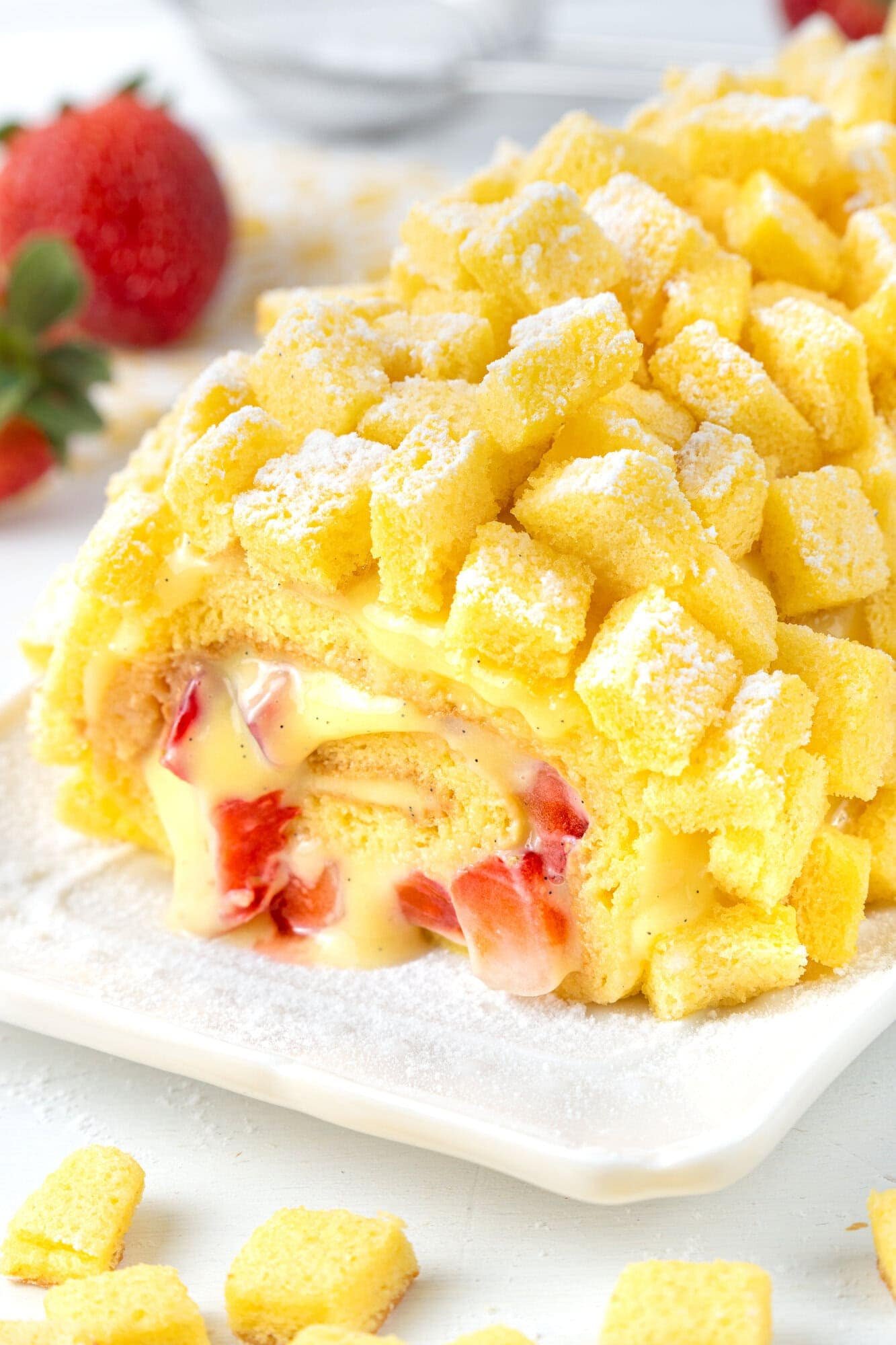 DessertsMimosa Roll with StrawberriesErrore nella risposta:Difficulty MediumPreparation 1 hourCooking 20 minutesServings for Serves 4 Send × Facebook Twitter Email Pinterest Save PrintThe Mimosa Roll with Strawberries is the perfect dessert to celebrate March 8th, International Women’s Day. There is no better way to celebrate than with a refined dessert with a delicate flavor. The Mimosa Roll is an original interpretation of the classic Mimosa cake, one of the most beloved cakes for Women’s Day. This modern version combines the lightness of a soft sponge roll with the freshness of strawberries and the creaminess of a velvety filling, creating an irresistible dessert.Perfect for a lunch or dinner with friends, the Mimosa Roll is an easy recipe for Women’s Day, suitable even for those without much cooking experience. Its preparation does not require complex tools or elaborate techniques, yet the result is surprising: an elegant dessert with a sunny color and a scenic appearance, reminiscent of the small yellow mimosa flowers, symbol of this special occasion.If you are looking for easy desserts for March 8th, the Mimosa Roll with Strawberries is the perfect choice: a balance of softness and freshness that will win everyone over at first taste. Prepare it to celebrate the important women in your life or simply to indulge in a moment of sweetness on this day dedicated to women’s strength.Ingredients for Serves 4For the Biscuit Dough:225 g of Egg Whites (about 6 large eggs)120 g of Egg Yolks (about 6 large eggs)150 g of White Sugar45 g of All Purpose Flour30 g of Potato Starch75 g of Seed Oilto taste of Vanilla Pods (or extract)8 g of PandoriniFor the Pastry Cream:500 g of Whole Milk120 g of White Sugar50 g of Corn Starch20 g of All Purpose Flour4 Egg Yolks1 Vanilla Pods (or extract)For the Filling:200 g of StrawberriesFor the Decoration:to taste of Powdered SugarCopy Ingredients ListOpen in AppMethodTo prepare the Mimosa Roll, start by making the Pastry Cream following our complete step-by-step recipe. Once ready, place it in a bowl, cover with plastic wrap making sure it touches the surface of the cream, and let it rest first at room temperature and then in the refrigerator for 2 hours.While the Pastry Cream is resting, proceed with preparing the Sponge Roll by placing egg whites, sugar, and vanilla seeds in the bowl of a stand mixer. Beat with the whisk attachment until stiff peaks form.Add the egg yolks and, using a spatula, gently fold them in with upward movements from the bottom to maintain the air in the mixture.Now add the sifted flour, cornstarch, and baking powder, folding gently from bottom to top. Then add the vegetable oil and incorporate it using the same folding technique.Grease a 30×20 cm (12×8 inch) baking pan with vegetable oil, line the bottom with parchment paper, pour in half of the batter, level it, and bake in a conventional oven at 190°C (375°F) for 15-20 minutes on the middle rack.Once baked, remove the sponge from the oven, use a small knife to detach it from the edges and flip it onto a dampened but well-wrung kitchen towel. Remove the parchment paper and immediately cover with plastic wrap to maintain moisture, which will help keep the sponge soft and pliable. Repeat these steps with the remaining batter.When the sponge has cooled, remove the plastic wrap and place it on a sheet of parchment paper with the prettier side down (this will be the visible side). Take the Pastry Cream, stir it gently, and spread a generous layer over the sponge.Wash the strawberries well, cut them into small cubes, and arrange them over the cream layer.Roll up the sponge starting from the shorter side. Place the roll on a serving plate, making sure the seam is at the bottom, then cover the entire roll with a light layer of pastry cream.Take the second sponge, remove the crust from the surface, trim the edges, and use a serrated knife to cut it into small, uniform cubes. Cover the entire roll with these cubes to create the characteristic ‘mimosa’ effect.Dust with powdered sugar, refrigerate for at least 1 hour, and your Mimosa Roll is ready to be served and enjoyed. Finally, remember to download our App with exclusive content and fewer ads!StorageThe Mimosa Roll can be stored in the refrigerator for 1-2 days without any issuesComments ★ ★ ★ ★ ★ × 4 / 5 You need to enable JavaScript to vote Cancel reply Leave a comment
