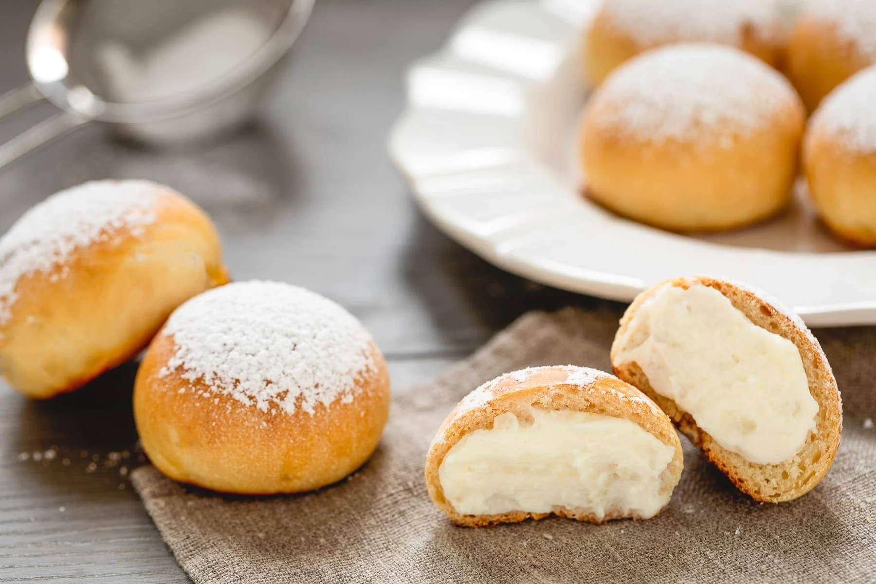 DessertsNuvole di Napoli (Neapolitan Sweet Snowflakes)Nuvole di Napoli, Neapolitan Snowflakes or Naples Clouds, are brioches inspired by the sweets of the Neapolitan pastry shop Poppella that are literally blowing up all over Italy.Difficulty MediumPreparation 1 hourCooking 40 minutesServings for 30 servings Send × Facebook Twitter Email Pinterest Save PrintHave you ever heard about “Nuvole di Napoli”? They literally translates to “Naples Clouds” but are also known as Snowflakes due to their appearance. You can’t go in Napoli without trying them, especially at the Neapolitan pastry shop “Poppella”, who invented them.At first glance they may look like simple filled bomboloni, but they are actually so much more! The name Nuvola (or Snowflake) comes from the lightness of the dough and lightness of the filling, which is composed of Milk, Ricotta Cheese and Cream. Truly mouthwatering!These Naples Clouds have become so famous that other bakeries and pastry shops have begun to reproduce them, but if you can’t immediately go to Naples to try them, the best way to enjoy them is to make them at home with your own hands.You have probably never tasted anything these Sweet Snowflakes, but you should fix that asap because they are really super delicious! So let’s find out right now how to cook these delicious Clouds of Naples! Ingredients for 30 servingsTo make the Dough:125 g of All Purpose Flour125 g of Manitoba Flour150 g of Whole Milk1 Eggs20 g of Butter40 g of White Sugar5 g of Dried Yeast1/2 of Lemon grated zesta pinch of Table SaltTo make the milk filling:200 ml of Whole Milk50 g of White Sugar20 g of Corn Starch10 g of Honey1/2 of Vanilla PodsTo make the ricotta filling:150 g of Ricotta Cheese150 g of Fresh Cream25 g of Powdered Sugar1/2 of Lemon grated zestTo finish:1 Egg Yolksto taste of Whole Milkto taste of Powdered SugarCopy Ingredients ListOpen in AppMethodTo prepare Naples Clouds dissolve the dry yeast in milk (at room temperature) provided for the dough and stir. Let it sit for 10 minutes then place it in the bowl of the planetary mixer along with the two flours, lemon zest and sugar. Knead everything at medium speed just enough to mix, then add the butter, in two times and let it be well absorbed. Add, lastly, the salt and incordate.Roll the dough onto a floured pastry board then place it back into the bowl, cover with food-grade plastic wrap and let rise until almost doubled in size (about 2 to 3 hours). Then divide the dough into portions weighing about 30 g each and roll it out on the pastry board so that it has a spherical shape. Place the resulting balls on a baking sheet lined with baking paper, spacing them well apart. Cover them with plastic wrap and let them rise until doubled in size (about 1 hour).In the meantime, prepare the creamed milk: in a small saucepan mix the milk, sugar and vanilla seeds. Heat until the sugar has dissolved, add the honey and dilute the well-sifted cornstarch, stirring with a whisk. Cook until the cream has thickened, stirring constantly. Transfer to a bowl, cover with plastic wrap and place in the refrigerator until chilled.For the ricotta cream: in a bowl, mix the sifted ricotta with the sugar. Add the whipped cream with electric whips, being careful not to disassemble it, and the grated lemon zest.Add the well-chilled milk cream as well and stir gently so as not to disassemble until combined. Transfer the resulting mixture to a sac à poche with a smooth nozzle and keep in the refrigerator.Brush the leavened snowflakes with egg yolk beaten with milk and bake them in a hot oven at 356°F (180°C) for 18 minutes. Remove from the oven and fill them warm with the cream by piercing the buns at the base. You will need to fill them generously.Once they are all stuffed dust your Naples Clouds with powdered sugar and serve. Finally, remember to download our App with exclusive content and fewer ads!Comments ★ ★ ★ ★ ★ × 5.0 / 5 You need to enable JavaScript to vote Cancel reply Leave a comment
