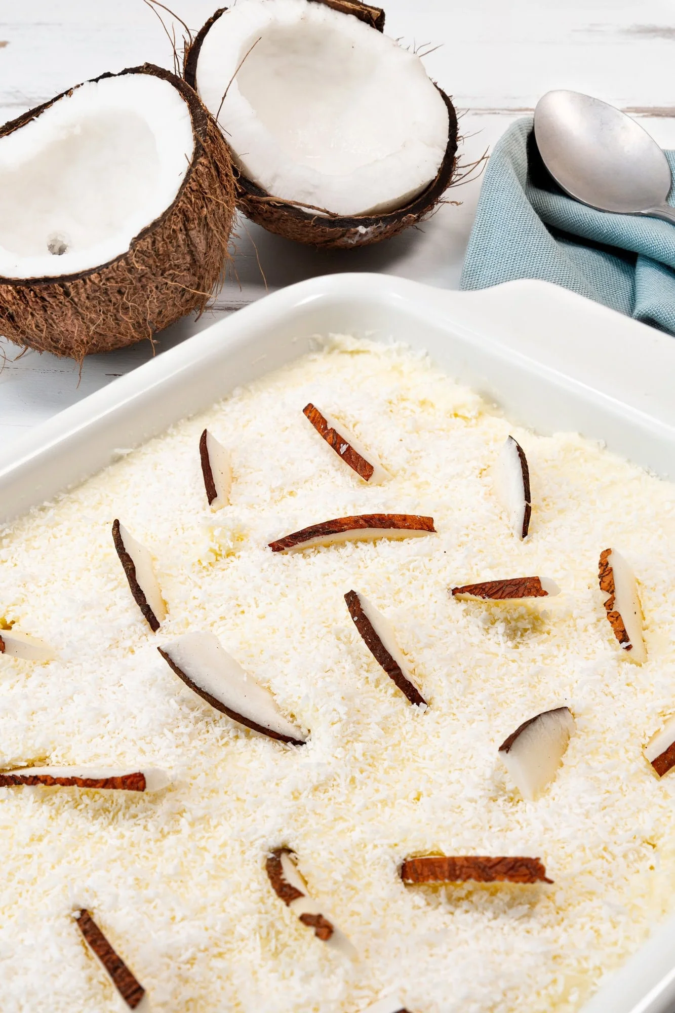 Spoon DishesNo-Eggs Coconut TiramisuA fresh and delicious Eggless Coconut Tiramisu made with cream and coconut milk.Difficulty MediumPreparation 30 minutesServings for Serves 6 Send × Facebook Twitter Email Pinterest Save PrintCoconut Tiramisu Without Eggs is a delightful twist on the classic dessert that satisfies those craving an indulgent egg-free treat. Perfect for lovers of exotic flavors with summer vibes, this dessert maintains its signature creaminess and rich taste through clever use of coconut.The No-Eggs Coconut Tiramisu Recipe is quick and easy to prepare – ideal for family gatherings or dinner parties. The secret lies in combining fresh, high-quality ingredients: mascarpone cheese (a rich Italian cream cheese), coconut milk, ladyfingers (savoiardi biscuits – available in Italian markets or online; substitute with sponge cake slices if unavailable), coffee, and shredded coconut.In this eggless version, coconut milk blends seamlessly with mascarpone cream – made using whipped cream and white chocolate – to create an ultra-silky filling. Assembling this dessert is effortless even for novice cooks. By following this recipe, you’ll impress guests with an original creation that merges Italian tradition with tropical flair through aromatic layers of coffee-soaked biscuits and coconut accents.Ingredients for Serves 61 1/4 cups of Mascarpone7 oz of Ladyfingers (Savoiardi)3/4 cup of White Sugar2/3 cup of Whipping Cream3.5 oz of White Chocolate1/3 cup of Coconut Milk2 oz of Desiccated Coconut3 cups of Espresso longCopy Ingredients ListOpen in AppMethodTo prepare the Eggless Coconut Tiramisu, start by placing mascarpone cheese and sugar in a large bowl. Mix them together using an electric mixer or a stand mixer.Melt the white chocolate in the microwave (or using a double boiler), add it to the mascarpone mixture and mix well until fully combined.Add a sprinkle of shredded coconut (about 30g) and mix until well incorporated into the cream. Add 50ml of coconut milk and stir. Whip the heavy cream and fold it into the mixture using a bottom-to-top motion.Prepare the coffee, let it cool down, and pour it into a shallow dish. Add the remaining coconut milk and mix well.Lightly dip the ladyfingers (savoiardi) in the coffee mixture and arrange them side by side to create an even layer in a baking dish. Spread a layer of the coconut mascarpone cream over the ladyfingers.Dust with some shredded coconut and continue creating a new layer of coffee-soaked ladyfingers, then complete with another layer of coconut mascarpone cream.Finish the Eggless Coconut Tiramisu by sprinkling shredded coconut on top and decorating with some dried coconut flakes.Let the Eggless Coconut Tiramisu rest in the refrigerator for 2-3 hours before serving. Finally, remember to download our App with exclusive content and fewer ads!Variations and AlternativesIf desired, you can add dark chocolate shavings as decoration and within the coconut cream layer.TipsIf the coconut cream turns out too thick, increase the amount of coconut milk in the preparation.StorageThe Eggless Coconut Tiramisu can be stored in the refrigerator for 1-2 daysComments ★ ★ ★ ★ ★ × 4 / 5 You need to enable JavaScript to vote Cancel reply Leave a comment
