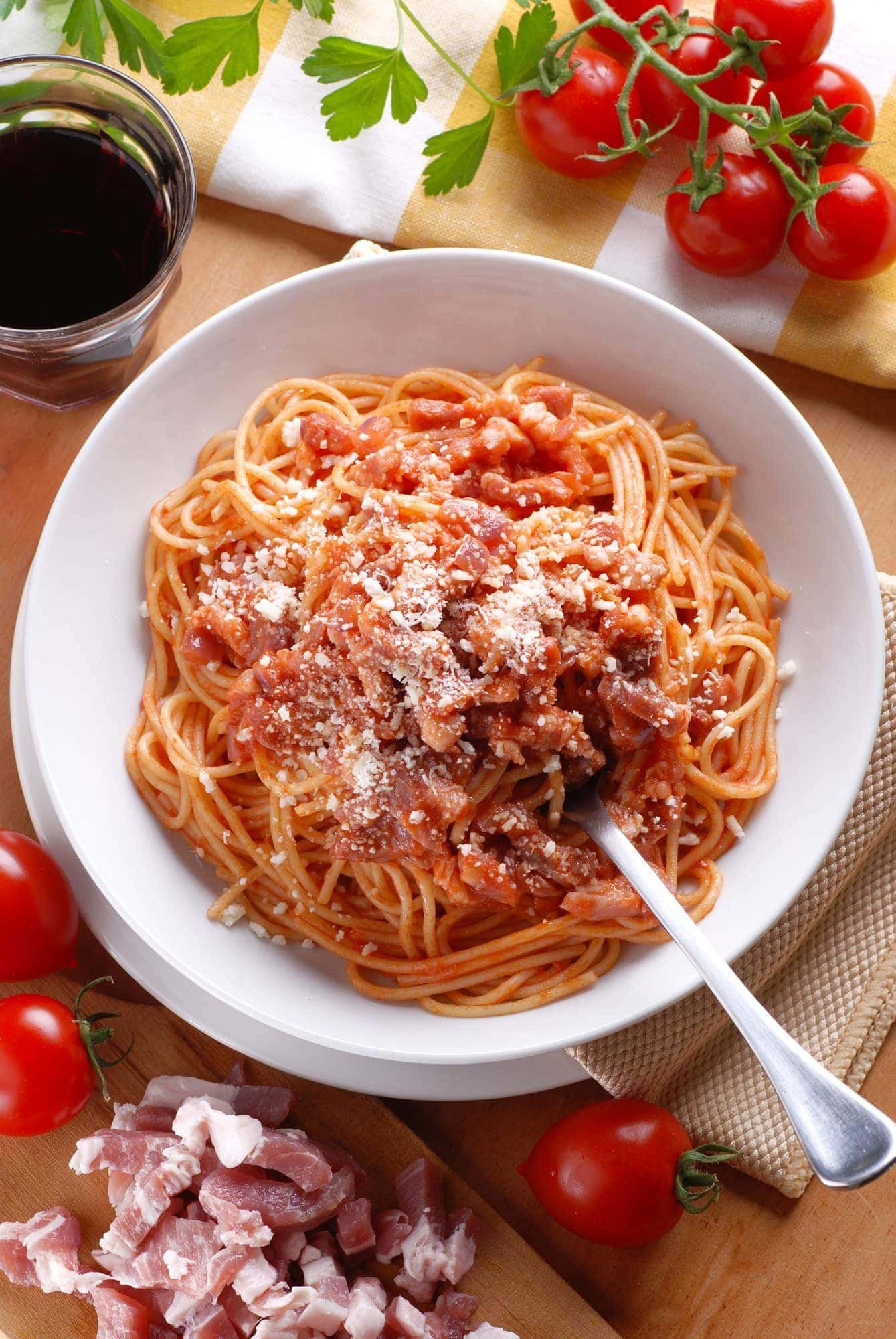 PastaSpaghetti Amatriciana, The Authentic Italian RecipePasta Amatriciana is an Italian dish made with tomato, cured pork jowl or pancetta, onion and pecorino. A classic comfort food loved for its rich and hearty taste.Difficulty EasyPreparation 5 minutesCooking 25 minutesServings for 4 people Send × Facebook Twitter Email Pinterest Save PrintPasta Amatriciana is among the most beloved traditional Italian pasta dishes ever. A very old dish, the recipe for Spaghetti all’Amatriciana has a very rich history, originating from the town of Amatrice in the central region of Lazio. This dish is made with a simple yet flavorful tomato sauce combined with cured pork jowl or pancetta and red pepper flakes, tossed with spaghetti or bucatini pasta. With its rich and hearty taste, pasta amatriciana is the perfect comfort food that is loved by many. Whether you’re looking for a quick and easy weeknight dinner or a special occasion meal, this dish is sure to satisfy.Ideal for preparing a lunch or dinner on the fly, Pasta Amatriciana is an ace up your sleeve when you have little time to spend at the stove, but the desire to enjoy a full-bodied comfort dish with typical Italian flavors.If you’re unable to find cured pork jowl or prefer not to use it, you can substitute it with Italian Pancetta or bacon (cooked until crispy). Of course the end result may have a slightly different flavor. Red pepper flakes or chili pepper is often used in a pasta amatriciana recipe to add a subtle heat to the dish (of course the use of chili pepper is optional and can be adjusted to your taste).So, let’s get started and discover the secrets to making a delicious pasta amatriciana!Ingredients for 4 people320 g of Spaghetti150 g of Guanciale (Cured Pork Jowl)400 g of Tomatoes80 g of Pecorino Cheese50 ml of White Wineto taste of Table Salt1 Chili Pepper smallCopy Ingredients ListOpen in AppMethodTo prepare Pasta Amatriciana start by blanching the tomatoes in salted water for about 90 seconds. Drain them and set them aside to cool. Meanwhile, remove the spicy part of the pork jowl and cut it into chunks.Brown the pork jowl in the pan without adding additional fat (oil or butter), keeping the flame medium and gradually setting aside the melted fat that will form at the bottom of the pan to avoid frying the pork jowl. While the pork jowl is browning peel the tomatoes and mash them in a bowl with the tines of a fork.Set the browned pork jowl aside, add some of the fat kept aside and deglaze with white wine. As soon as the alcohol has evaporated, add the tomatoes and chili and adjust the salt. Cook the sauce over a low flame for about 2o minutes.In the meantime, boil the pasta in salted water. Drain it al dente, keeping a few ladles of the cooking water aside. Pour the spaghetti directly into the pan with the sauce, add the pork jowl and finish cooking for another 4-5 minutes. Should the sauce be too dry, add a little of the pasta cooking water.Turn off the heat and sprinkle the Pasta Amatriciana with plenty of grated pecorino cheese before serving. Finally, remember to download our App with exclusive content and fewer ads!TipsAlways remove the spicy part of the pork jowl before browning it because it could release bitter notes that would spoil the final flavor of the dish. We recommend that you fade only the fat and not the pork jowl to keep it crispier. Avoid adding other fats because they will not be necessary and could alter the flavor of the seasoning.StorageSpaghetti all’Amatriciana can be stored in the refrigerator, inside an airtight container, for 1 day. We do not recommend that they be frozen.Comments ★ ★ ★ ★ ★ × 5 / 5 You need to enable JavaScript to vote Cancel reply Leave a comment