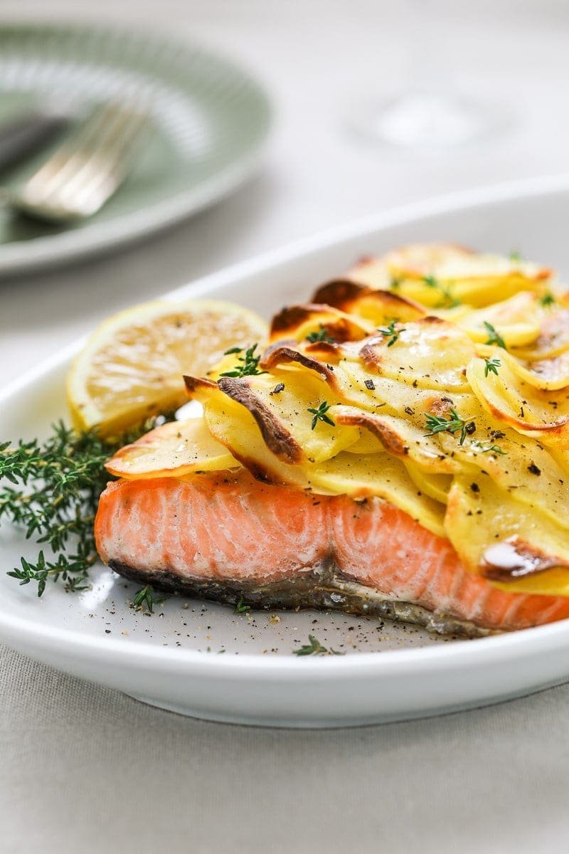 MainsPotato Crusted SalmonPotato-Crusted Salmon: A light, meatless entree with a gourmet touch, just right for any special occasion.Difficulty EasyPreparation 15 minutesCooking 25 minutesServings for 4 people Send × Facebook Twitter Email Pinterest Save PrintIn the mood for a seafood delicacy that’s both simple to whip up and impressively gourmet? Allow us to introduce the Potato-Crusted Salmon. This dish, with its subtle flavors and elegant presentation, promises to charm even the most selective taste buds.In just under 15 minutes, you can curate a dish that would be the star of any festive spread. The brilliance of the potato crust ensures that the salmon remains succulent during the cooking process. Thinly-sliced potatoes crispen up swiftly, while a medley of aromatic herbs like thyme, marjoram, and parsley infuse the dish with zest and vigor.Ingredients for 4 people800 g of Salmon Fillets3 Potatoes2 sprigs of Thyme2 sprigs of Marjoramto taste of Extra Virgin Olive Oilto taste of Table Saltto taste of Black PepperCopy Ingredients ListOpen in AppMethodTo prepare Salmon in Potato Crust rinse the salmon fillet, pat it dry with kitchen paper and remove any bones by helping yourself with tweezers. Transfer to the inside of a baking dish lined with baking paper.Skin the potatoes and cut them into very thin slices, even helping with a mandoline. Blanch them in salted water for 3-4 minutes, drain them with a slotted spoon and let them dry on a tea towel or paper towel.Sprinkle the salmon fillet with a little oil, salt, pepper, finely chopped marjoram and thyme and make a first layer of overlapping potato slices. Season with salt, pepper, grease with a little oil (or they will slide over themselves) and add more chopped herbs. Make a second layer and season in the same way.Bake in the preheated oven at 360°F (180°C) for about 20 minutes, finishing with another 5 minutes under the grill until the potatoes have developed a nice golden crust. Finally, remember to download our App with exclusive content and fewer ads!Variations and AlternativesSalmon in Potato Crust can also be prepared with thawed salmon fillets, which is cheaper and equally tasty.TipsFor best results, cook your Salmon in Potato Crust just before bringing it to the table. If you prepare it too far in advance you will lose the “crispiness” of the potato crust.StorageSalmon in Potato Crust will keep in the refrigerator for 2-3 days, well covered with foil. It is recommended to be eaten after reheating it in the oven for a few minutes.Comments ★ ★ ★ ★ ★ × 4.9 / 5 You need to enable JavaScript to vote Cancel reply Leave a comment