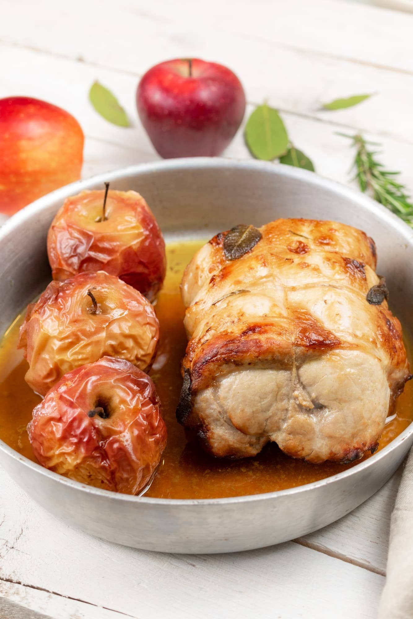 MainsRoast Pork Loin with ApplesA harmonious blend of tender pork loin and aromatic apples, this dish is the ultimate choice for festive lunches and notable occasions.Difficulty MediumPreparation 20 minutesCooking 1 hour and30 minutesServings for 4 people Send × Facebook Twitter Email Pinterest Save PrintElevate your Sunday lunch or grand celebrations with the exquisite pairing of succulent pork loin and sweet apples. This delightful main course melds simplicity with gourmet flavors, ensuring an experience that will impress both you and your guests.Our Oven-Roasted Pork Loin with Apples is effortless to create, requiring only a handful of easily accessible ingredients. Yet, the end result is a beautifully roasted pork loin infused with the fragrant sweetness of apples.While our recipe emphasizes oven-roasting, culinary enthusiasts can also adapt it to the stovetop. Using a cast-iron saucepan or similar heavy-bottomed pot ensures gentle, even cooking, resulting in tender, juicy meat.The baked apple variation on the classic pork loin offers room for creativity. Feel free to sprinkle in your favorite spices, adjusting the dish to your palate.Ingredients for 4 people1.5 Kg of Pork Loin5 Apples2 cloves of Garlic1/2 glass of White Wine Vinegar1/2 glass of Marsalato taste of Sageto taste of Rosemaryto taste of Vegetable Brothto taste of Extra Virgin Olive Oilto taste of Butterto taste of Table Saltto taste of Black PepperCopy Ingredients ListOpen in AppMethodTo prepare Pork Loin with Apples first tie with a string the Pork Loin.Once tied, season with salt and pepper and brown the loin well on all sides in a saucepan with a little olive oil, a knob of butter, the garlic cloves, sage leaves and rosemary sprigs.Smoke with the white wine and marsala, let the alcohol part evaporate and transfer to the oven and bake at 360°F (180°C) for about 1 hour and 30 minutes or at least until the meat is well cooked. While cooking, turn the arista thoroughly and add some broth as needed.Halfway through cooking, add the well-washed apples and continue until both the apples and the meat are well cooked.Once ready take it out of the oven, let the loin rest for a few moments and slice it. Remove the apples, take the pulp and arrange it, along with the cooking juices on the slices of meat. Serve your Loin with Apples warm. Finally, remember to download our App with exclusive content and fewer ads!Variations and Alternatives TipsWe recommend that you use small-to-medium sized apples. You will thus reduce cooking time.StoragePork Loin with Apples will keep once cooked for 1-2 days in the refrigerator.Comments ★ ★ ★ ★ ★ × 5 / 5 You need to enable JavaScript to vote Cancel reply Leave a comment