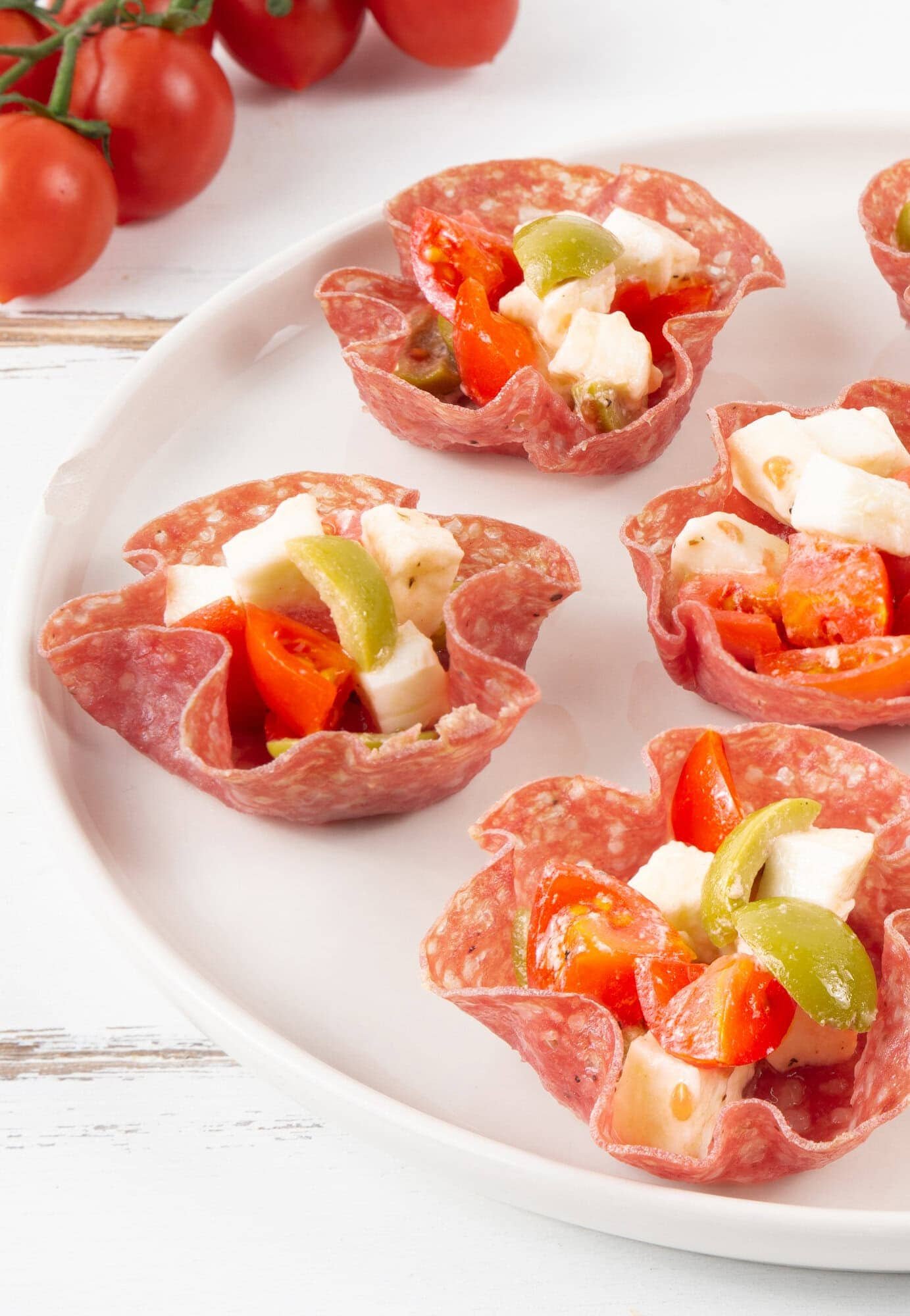 Snack & AppetizersSalami Cups with Mozzarella, Cherry Tomatoes and OlivesBaked Salami Cups with Mozzarella and Cherry Tomatoes: an easy, quick, tasty and colorful appetizer, perfect for aperitifs and buffets.Difficulty MediumPreparation 15 minutesCooking 5 minutesServings for 6 Send × Facebook Twitter Email Pinterest Save PrintThese Salami Cups are a delightful and colorful appetizer that will win over all your guests: the combination of savory Italian salami (you can use Genoa salami or any good quality Italian-style salami) with the freshness of diced mozzarella and the sweetness of cherry tomatoes makes this recipe truly delicious.The Salami Cups Recipe is an excellent make-ahead option that will show you how to prepare easy and quick Baked Salami Cups. It’s a brilliant time-saving recipe perfect for holiday lunches and dinners when preparing appetizers in advance is a smart move to save time.Excellent when served as Holiday Appetizer Cups, these crispy and inviting Salami Cups act as a base for a tasty and delicious filling that you can always customize according to the season or your personal taste. For best results, use thinly sliced salami that’s not too dry, as it needs to be pliable enough to form into cups in a muffin tin.Ingredients for 612 slices of Salami tipo Milano1 Mozzarella10 Cherry tomatoesto taste of Green Olive pittedto taste of Table Saltto taste of Extra Virgin Olive Oilto taste of Black PepperCopy Ingredients ListOpen in AppMethodTo prepare the salami cups with mozzarella and cherry tomatoes, start by preheating the oven to 180°C (356°F) in conventional mode. While the oven is heating, take a muffin tin and place one slice of salami (Italian dry-cured sausage) in each cavity of the tin: press them well against the sides to create cup shapes.When the oven is hot, bake for about 5 minutes, until the salami becomes slightly crispy. Meanwhile, cut the mozzarella into small cubes, and chop the cherry tomatoes and pitted olives into pieces. Place all ingredients in a bowl and season with olive oil, salt, and pepper.Remove the salami cups from the oven and let them cool for a few minutes. Once cooled, carefully remove them from the muffin tin. Fill each cup with the prepared mixture of mozzarella, cherry tomatoes, and olives.Your Salami Cups are now ready to be served and enjoyed! These make perfect Italian-style appetizers for parties or gatherings. Finally, remember to download our App with exclusive content and fewer ads!Variations and AlternativesYou can customize your salami cups by replacing mozzarella with other Italian cheeses like smoked scamorza or provolone. For added variety, try incorporating sun-dried tomatoes, capers, or grilled bell peppers. These Mediterranean additions will complement the salami perfectly.TipsFor best results, choose a high-quality salami, not too thinly sliced, that will maintain its shape during cooking. Traditional Italian salami works particularly well for this recipe.StorageIf you have leftovers, you can store your salami cups in the refrigerator for up to 24 hours, covered with plastic wrap. Bring to room temperature before serving for the best flavor.Comments ★ ★ ★ ★ ★ × 4 / 5 You need to enable JavaScript to vote Cancel reply Leave a comment