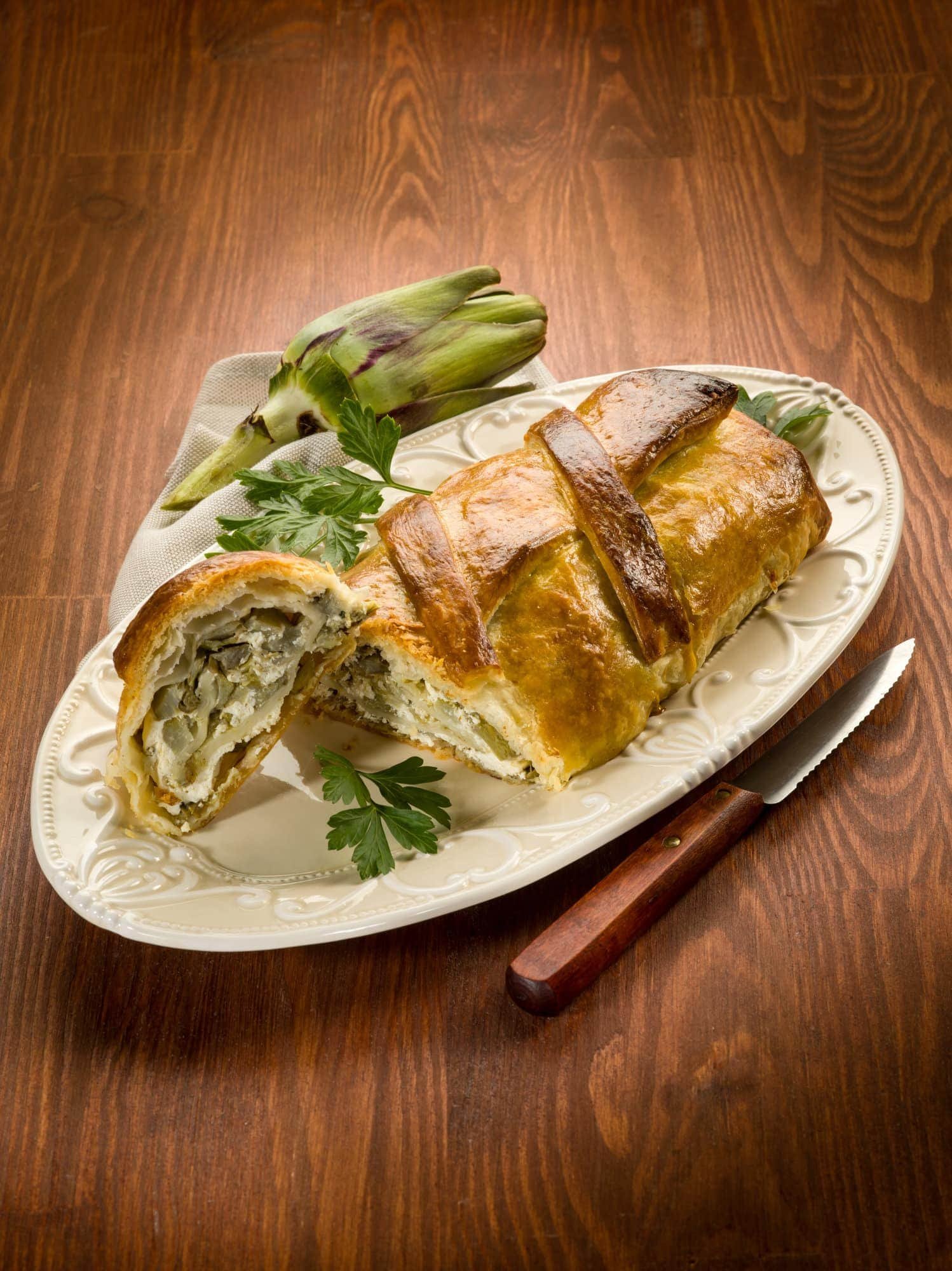 Savory PiesSavory Artichoke Strudel, Italian RecipeSavory Artichoke Strudel is a delicious Puff Pastry Roll filled with Artichokes, Ricotta, and Pecorino cheese. Quick and easy to make, it's perfect as an appetizer!Difficulty EasyPreparation 15 minutesCooking 10 minutesServings for Serves 4 Send × Facebook Twitter Email Pinterest Save PrintThe Savory Artichoke Strudel is a delicious savory pie that is easy and quick to prepare. Made with just a few simple ingredients, it is essentially a Puff Pastry Roll Filled with Artichokes, Ricotta, and Pecorino Cheese.Perfect for an aperitif or to serve as an appetizer, this Artichoke Strudel is also ideal for Easter lunch or simply for an Easter Monday picnic. The Puff Pastry Strudel with Artichokes is also a great solution if you have unexpected guests and don’t know what to cook!If you are looking for other Savory Strudel Recipes, don’t miss the Broccoli and Scamorza Savory Strudel, the Gorgonzola and Pear Savory Strudel, and the Ricotta and Spinach Strudel! And now here is the recipe for the Savory Artichoke Strudel!Ingredients for Serves 45 artichokes of Artichockes1 package of Puff Pastry Rectangular150 gams of Ricotta Cheese100 gams of Pecorino Cheese Grated1 clove of Garlicto taste of Lemon Juiceto taste of Milkto taste of Extra Virgin Olive Oilto taste of Table SaltCopy Ingredients ListOpen in AppMethodTo prepare the Savory Artichoke Strudel, start by cleaning the artichokes. Remove the tough outer leaves, cut off the stem and trim the pointed tips.Cut them into quarters, remove the fuzzy choke from the center, and slice them thinly. As you slice them, place them in a bowl filled with water and lemon juice to prevent browning.In a large non-stick pan, sauté the garlic in a drizzle of extra virgin olive oil. Once the garlic has browned, remove it from the pan and add the drained artichokes.Let them brown for a few minutes, stirring to ensure even cooking, then turn off the heat and let them cool completely.In a large bowl, mix together the ricotta, grated Pecorino cheese, cooled artichokes, and a pinch of salt until you obtain a creamy and uniform filling.Unroll the puff pastry on your work surface and roll it out slightly with a rolling pin. Spread the filling on the short side of the rectangle, covering only the first portion of the pastry.Very gently, roll the pastry over the filling until completely closed. Slightly moisten the edges of the pastry with a drop of water so they adhere perfectly to each other.Brush the strudel with a little milk and bake in a preheated oven at 180-200°C (355-392°F) for about 10 minutes, or until the pastry turns golden brown. Once ready, let it cool slightly and serve your Savory Artichoke Strudel! Finally, remember to download our App with exclusive content and fewer ads!Variations and AlternativesYou can enrich the filling of the Artichoke Savory Strudel with additional ingredients such as diced Speck (smoked prosciutto), sliced cooked ham, or béchamel sauce and Scamorza cheese (Italian semi-soft cheese similar to mozzarella).TipsIf you’re worried that your Artichoke Savory Strudel might open during baking, you can create thin strips of puff pastry and place them where the strudel closes to keep it more secure.StorageThe Artichoke Savory Strudel can be stored in the refrigerator for a few days in an airtight container.Comments ★ ★ ★ ★ ★ × 5 / 5 You need to enable JavaScript to vote Cancel reply Leave a comment