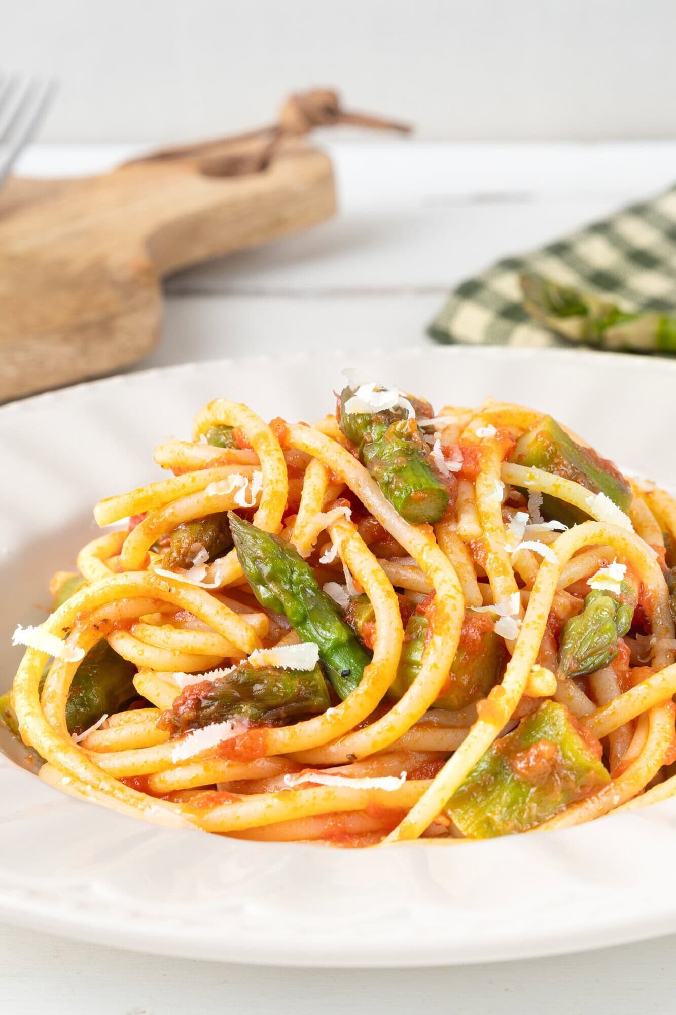 PastaSpringtime Pasta with Tomato and Asparagus SauceDiscover the recipe for Springtime Pasta with Asparagus Sauce, a delicious and easy-to-make first course. This Pasta with Asparagus Sauce is perfect for a healthy and flavor-packed meal!Difficulty MediumPreparation 5 minutesCooking 15 minutesServings for 4 servings Send × Facebook Twitter Email Pinterest Save PrintIf you’re looking for a delicious, healthy main course that’s perfect for spring, Pasta with Tomato and Asparagus Sauce is the ideal recipe for you. This dish combines the delicate flavor of asparagus with the creaminess of a flavorful sauce, creating a perfect balance between lightness and taste. The Asparagus Pasta Recipe is a refined choice for anyone wanting to bring a dish rich in natural flavors to the table, without compromising on ease of preparation.Asparagus, the star of this recipe, is a beloved spring vegetable known for its unique flavor and numerous health benefits. Rich in vitamins, fiber, and antioxidants, asparagus makes this Pasta with Asparagus Sauce Recipe not only delicious but also healthy. The combination of a velvety sauce and perfectly cooked al dente pasta makes this first course perfect for any occasion, from a family lunch to a special dinner with friends.In this recipe, we’ll show you step by step how to prepare an easy and quick Pasta with Tomato and Asparagus Sauce, perfect even for those with little time in the kitchen who don’t want to sacrifice taste. We’ll also reveal a few tricks to bring out the flavor of the asparagus and make your sauce even creamier and more inviting.Ingredients for 4 servings320 gams of Paccheri1 bunch of Asparagus300 gams of Whole Tomatoes1 clove of Garlicto taste of Table Saltto taste of Black Pepperto taste of Extra Virgin Olive OilCopy Ingredients ListOpen in AppMethodTo prepare Pasta with Asparagus Sauce, start by removing the tough, woody ends from the asparagus. Rinse them thoroughly, then, using a sharp knife, cut them into small pieces.In a large skillet, sauté a clove of garlic in a drizzle of olive oil. Add the chopped asparagus, season with salt and pepper, and sauté over high heat for a few moments. Then, add the peeled tomatoes, gently crush them with a fork, season with salt, mix well, and let it cook on low heat with a lid for about twenty minutes.Cook the pasta in plenty of salted boiling water. Drain it slightly al dente, reserving some of the cooking water. Transfer it directly to the skillet and finish cooking, adding a little of the reserved pasta water as needed.Once well cooked, serve the Pasta with Asparagus Sauce hot, finishing it off with a generous grating of Parmigiano Reggiano cheese. Finally, remember to download our App with exclusive content and fewer ads!TipsFor the preparation of Pasta with Asparagus Sauce, try to use asparagus that is not too thick for a more tender texture.StoragePasta with Asparagus Sauce can be stored in the refrigerator for 2-3 days without any issues.Comments ★ ★ ★ ★ ★ × 5 / 5 You need to enable JavaScript to vote Cancel reply Leave a comment