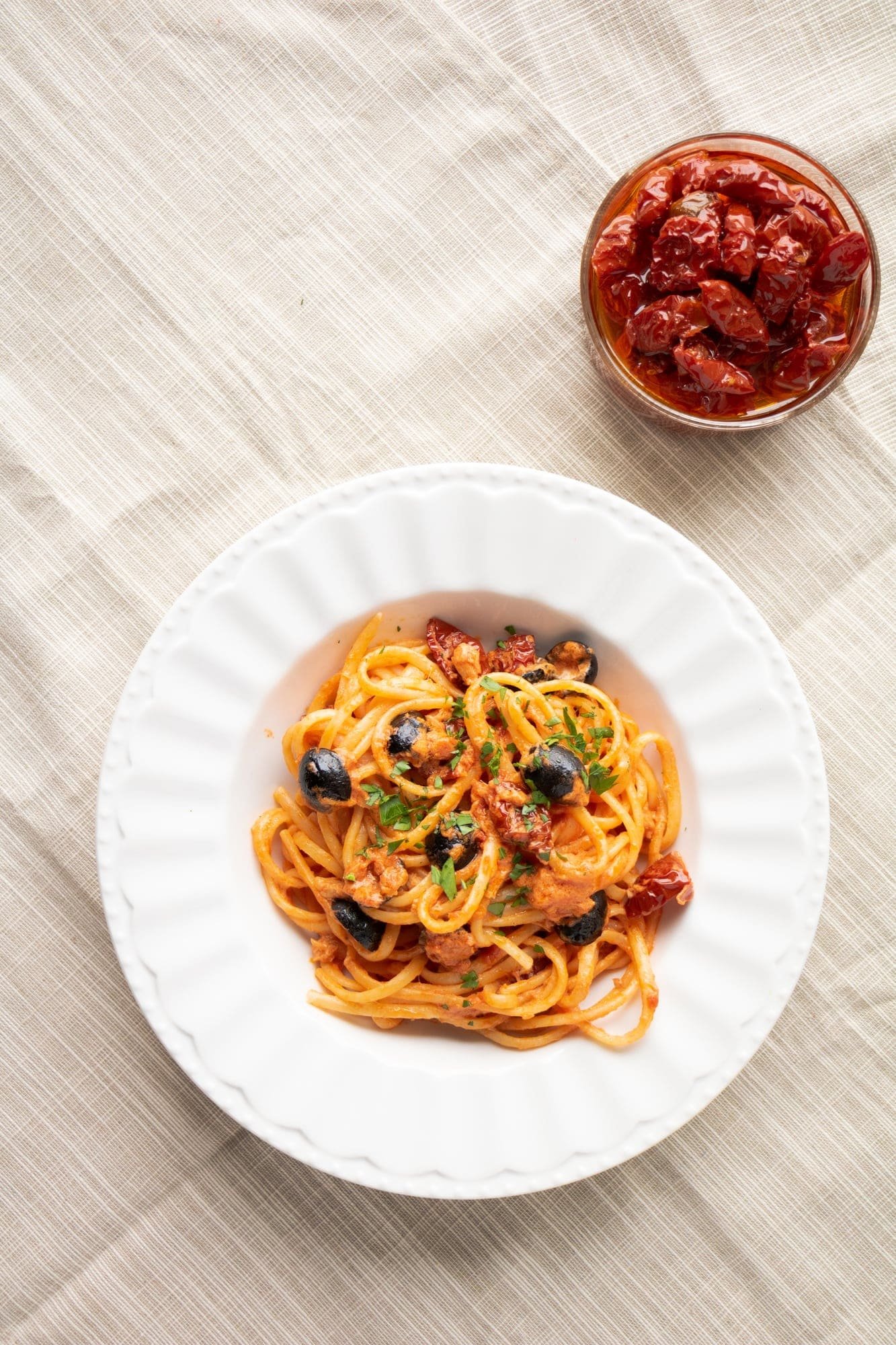 Creamy Tuna Pasta with Olives and Dried Tomatoes